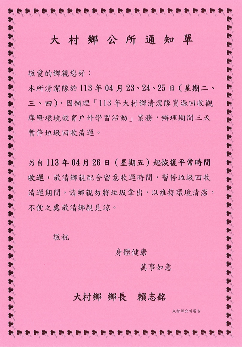 最新公告 📣垃圾停收訊息快報📢 歷史訊息 | 發布日期: 2024/04/17~2024/05/17 | 瀏覽人數: 35人 | 聯絡資訊: 清潔隊 04-8520149 大村鄉公所清潔隊🚖訂於113年4月23.24.25 日(周二.周三.周四)三天🚜舉辦資源回收暨環境教育戶外學習活動🍀活動期間🍀全鄉暫停收運垃圾三日。