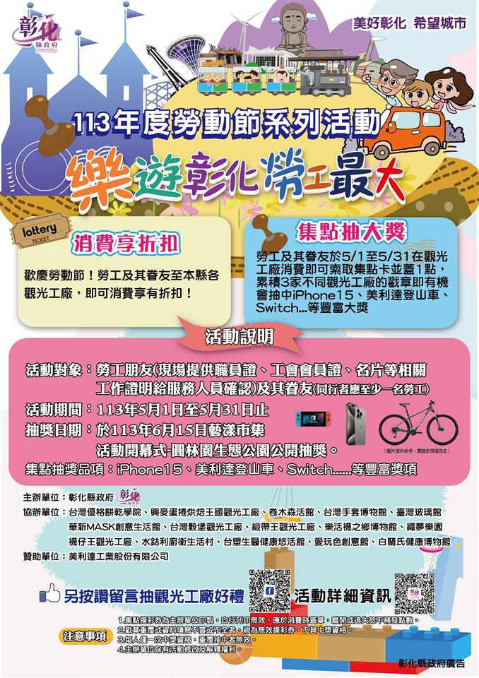 最新公告 「樂遊彰化‧勞工最大」!15家觀光工廠消費享折扣、集點抽大獎!iPhone15、switch、美利達登山車…多項大禮等你帶回家~ 歷史訊息 | 發布日期: 2024/04/29~2024/05/29 | 瀏覽人數: 52人 | 聯絡資訊: 行政課 04-8520149 歡慶勞動節!彰化縣政府特與縣內15家觀光工廠共同舉辦「樂遊彰化‧勞工最大」活動,5/1~5/31期間,勞工朋友只要持在職相關證明,不論是名片、識別證、工會會員證、甚至穿著公司制服等,勞工與其同行的家人、親朋好友到觀光工廠消費即享有優惠方案,另有不限金額之消費,即可索取集點卡蓋章,蓋滿3家不同觀光工廠戳章,就可以參加摸彩活動!最大獎為iPhone15,還有Switch遊戲機、美利達登山車、掃地機器人、知名賣場電子禮券及觀光工廠好禮等豐富大獎,等你來參加! 五一勞動節是勞工年度重大節日,為感謝勞工朋友對社會經濟的付出與貢獻,彰化縣政府辦理「樂遊彰化‧勞工最大」活動,鼓勵勞工朋友與家人、親朋好友走出戶外、放鬆身心!同行者中只要1名具勞工身份(請提供公司職員證、工會會員證、名片、服務證明…等佐證資料提供觀光工廠服務人員確認),勞工及其同行眷屬、親朋好友皆可於觀光工廠享消費折扣、集點抽獎! 「彰化很有料,過去太低調」,彰化有很多優質的產品、優良食品製造廠、隱形冠軍企業,縣政府今年度規劃「樂遊彰化‧勞工最大」活動,期望勞工朋友在專屬勞工的五月份,能與家人、親朋好友走出戶外,放鬆身心之餘,更深度走訪彰化、認識彰化。 本次活動參加觀光工廠有卷木森活館、臺灣玻璃館、緞帶王觀光工廠、台灣優格餅乾學院、興麥蛋捲烘焙王國、台塑生醫健康悠活館、水銡利廚衛生活村、樂活襪之鄉博物館、愛玩色創意館、織夢樂園、襪仔王觀光工廠、台灣穀堡、台灣手套博物館、白蘭氏健康博物館、華新MASK創意生活館等,並特別感謝MERIDA美利達自行車特別贊助3台登山車於活動抽獎。 活動詳細內容請上彰化縣政府勞工處網站查詢,另彰化縣政府特別加碼抽觀光工廠好禮活動,即日起至勞工處臉書粉絲專頁「樂遊彰化‧勞工最大」活動貼文底下按讚及留言,就有機會抽中觀光工廠好禮!網址:https://www.facebook.com/labor.chcg/posts/pfbid02CJ4N8iY1HaZT9BMY8z5Ao9TzwZ2pUpj5mwKdxYzK82mSs7Up3N54cpzLKugbE4RNl