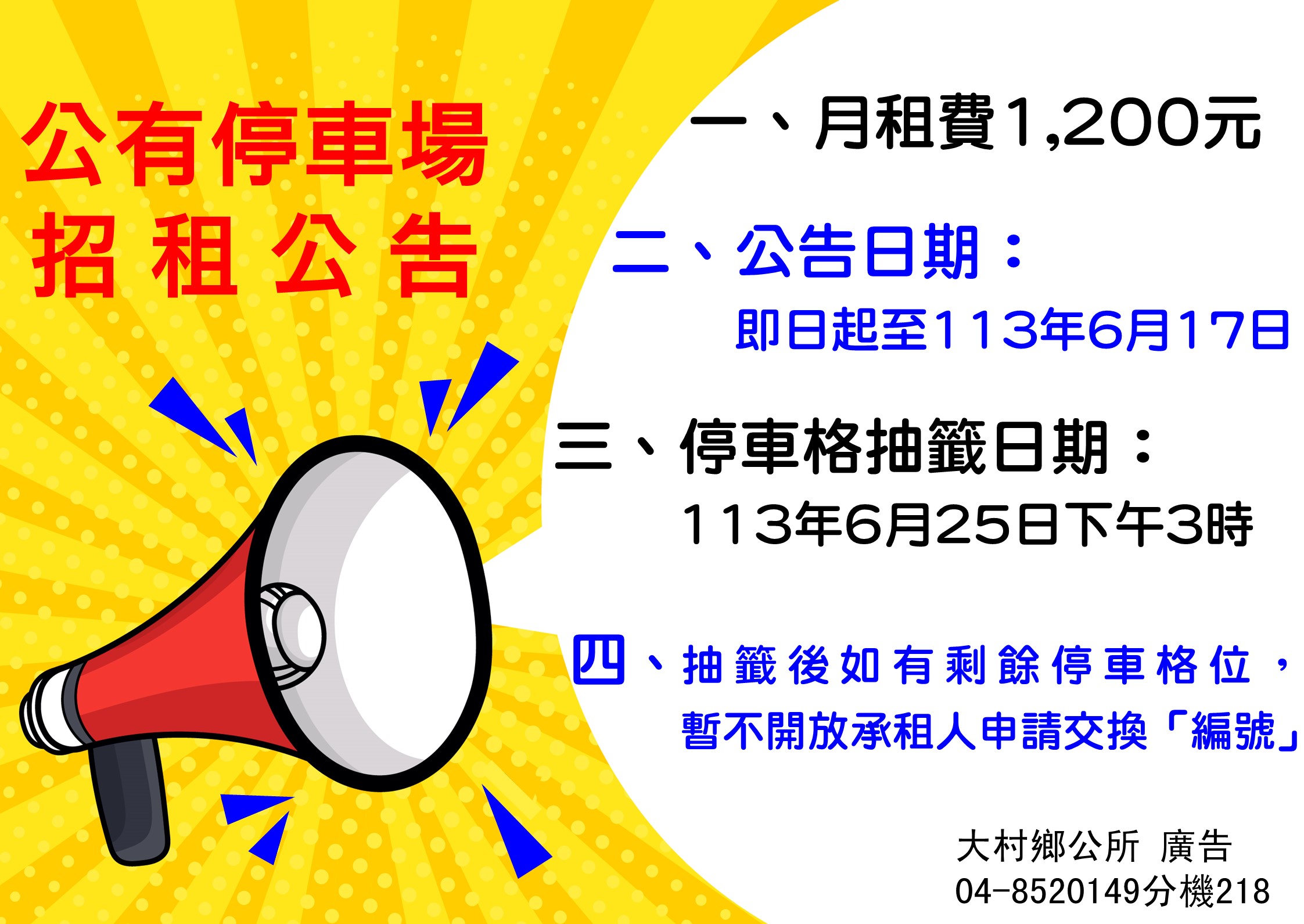 最新公告 💥公告大村鄉公有停車場招租💥 歷史訊息 | 發布日期: 2024/06/07~2024/07/07 | 瀏覽人數: 88人 | 聯絡資訊: 建設課 04-8520149 💵月租費1,200元💰📣公告日期:即日起至113年6月17日停車格抽籤日期:113年6月25日下午3時🚘🎲抽籤後如有剩餘停車格位,暫不開放承租人申請交換「編號」停車場位置:彰化縣私立日光幼兒園(大村鄉仁愛街89號)對面🚖☎️聯絡電話:04-8520149─分機218📞歡迎鄉親踴躍租用~~