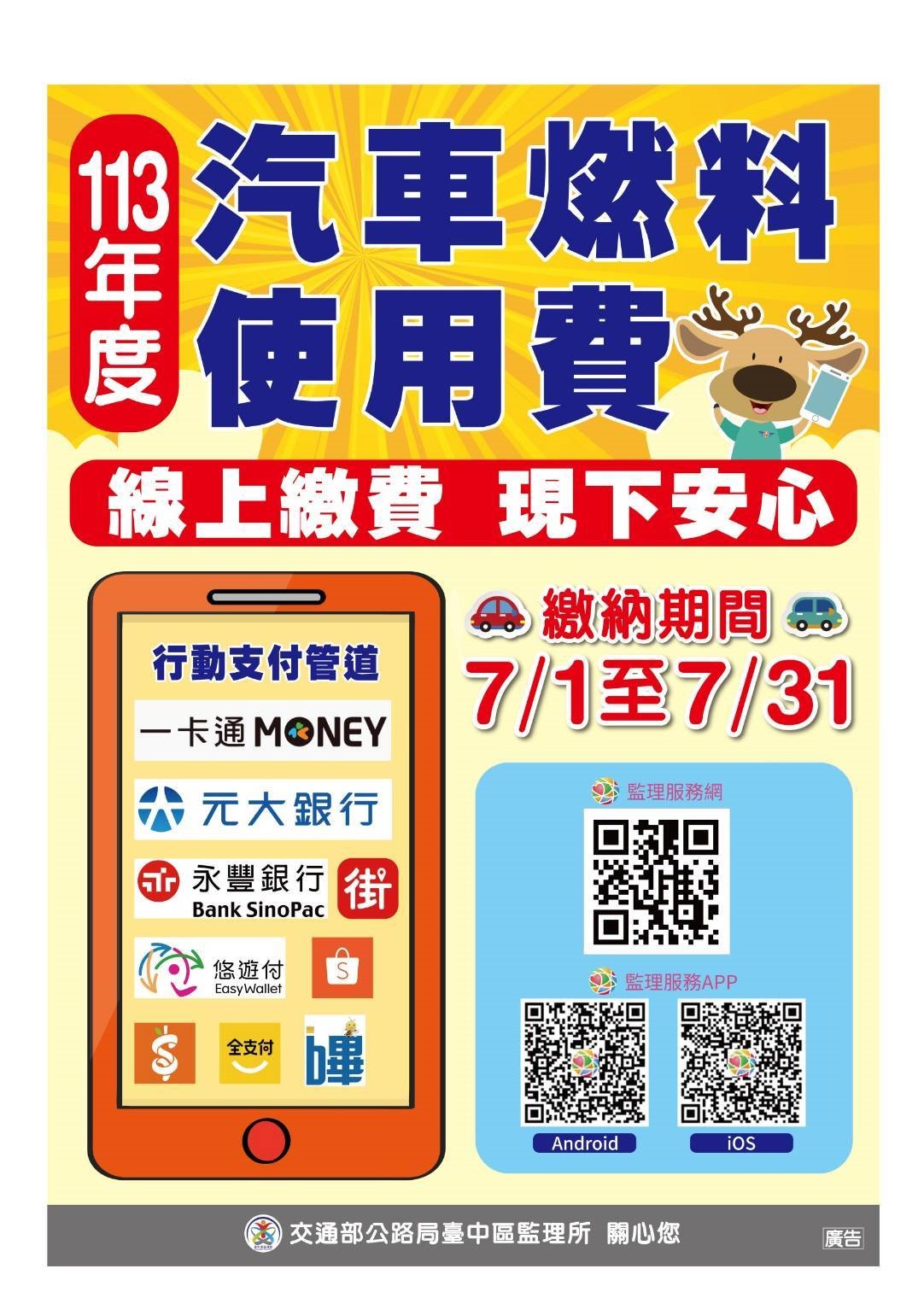 最新公告 113年度多元繳納汽車燃料使用費宣導! 歷史訊息 | 發布日期: 2024/06/20~2024/07/20 | 瀏覽人數: 63人 | 聯絡資訊: 財政課 04-8520149 「『多元繳納汽燃費,線上繳費,現下安心』透過監理服務網、監理服務APP與行動支付繳納113年汽燃費,方便又省時,彰化監理站關心您!」