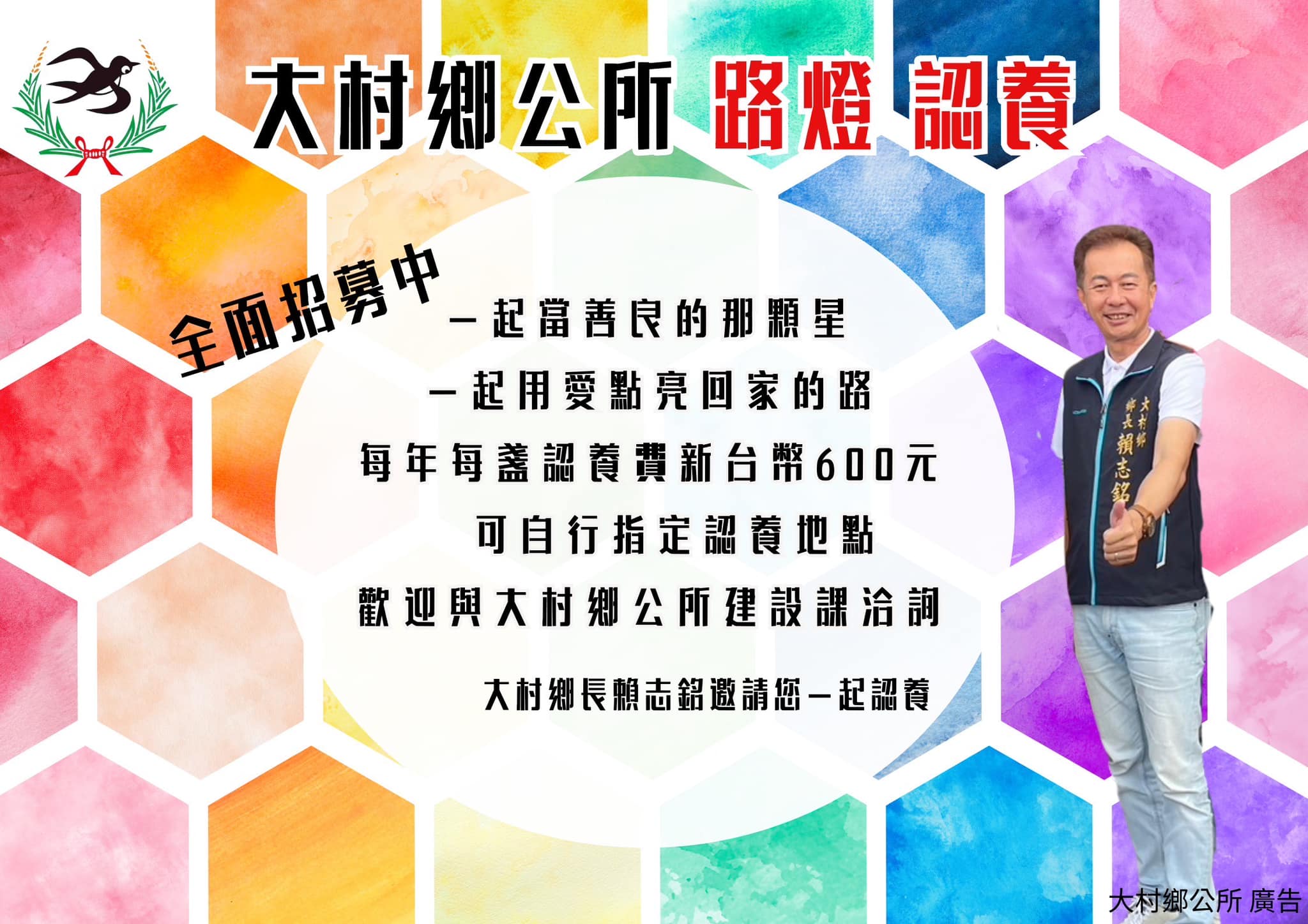 最新公告 💡歡迎加入路燈認養獻愛心💡 歷史訊息 | 發布日期: 2024/07/16~2024/12/31 | 瀏覽人數: 46人 | 聯絡資訊: 建設課 04-8520149 ❤️❤️盞盞幸福 點亮大村 ❤️❤️ 齊心點亮夜間道路 共同提升居住品質 鄉長賴志銘邀請大家一起參與路燈認養的計畫,共同點亮每一條道路,也為自己點上一盞光明燈! 🌟🌟可以指定認養地點,還會寫上自己的名字或企業名稱唷! 📍辦法:認養路燈以盞為單位 📍費用:每盞每年新臺幣600元 📍認養期間:以「年」為單位,期滿 可以再申請繼續認養 📍認養位置:可自行指定認養「地點」及「盞數」,若不指定地點則由公所代為指定 📍憑認養收據也可抵免所得稅! 詳情請洽 📱📱大村鄉公所建設課04-8520149