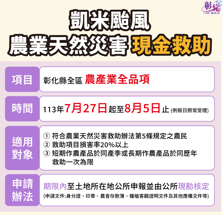 最新公告 彰化農損現金救助自即日起至 8/5日前向土地所在地公所申報農損! 歷史訊息 | 發布日期: 2024/07/27~2024/08/30 | 瀏覽人數: 42人 | 聯絡資訊: 農業課 04-8520149分機114 農業部公告彰化縣為『全品項』適用農業天然災害現金救助及低利貸款地區後,請農民自即日起至8/5,這次不需要三方會勘,向土地所在地公所申報農損外,請受損農民儘快的申請,盡速復耕,減少損失。 連絡電話04-8520149分機114農業課洽詢