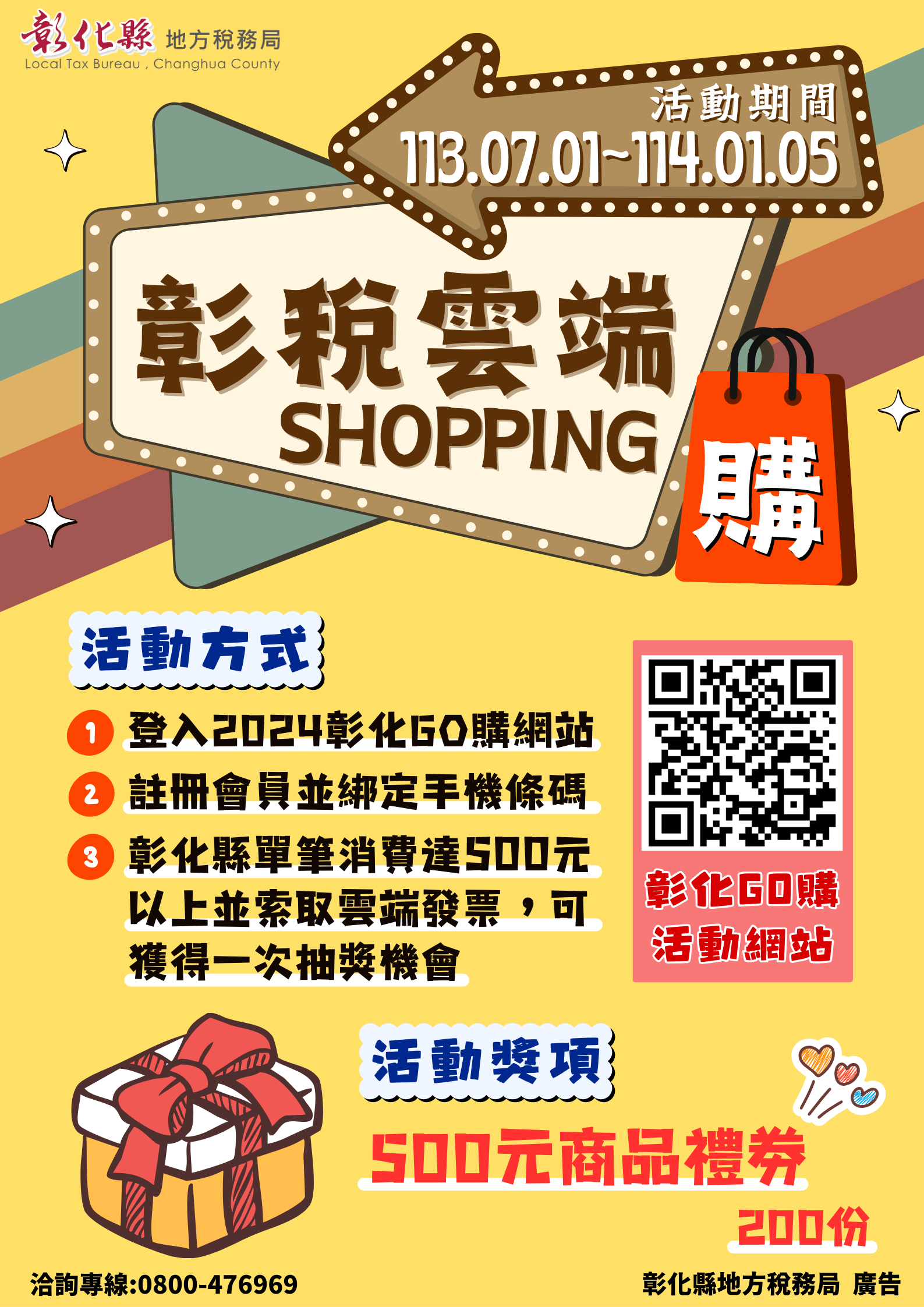 最新公告 113年「彰稅雲端Shopping購」活動! 歷史訊息 | 發布日期: 2024/07/31~2024/08/31 | 瀏覽人數: 36人 | 聯絡資訊: 財政課 04-8520149 活動期間自即日起至114年1月5日止,期間內至2024彰化GO購活動網站(https://changhua-go.chcg.gov.tw/)註冊會員綁定手機條碼,並於本縣消費時使用「手機條碼」索取雲端發票,且單張消費金額達500元以上,即可獲抽獎序號,就有機會取得500元全聯禮券等好禮。