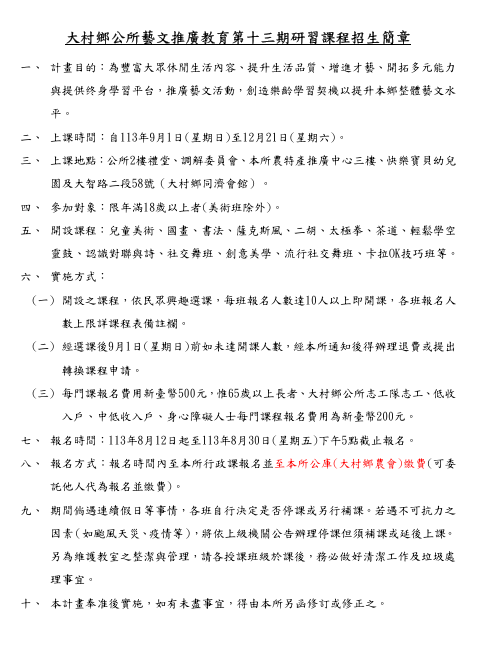最新公告 大村鄉公所藝文推廣教育第十三期研習課程招生簡章訊息快報! 歷史訊息 | 發布日期: 2024/08/09~2024/09/09 | 瀏覽人數: 161人 | 聯絡資訊: 行政課 04-8520149 大村鄉公所藝文推廣教育第十三期研習課程招生簡章報名方式:報名時間內至本所行政課報名並至本所公庫(大村鄉農會)缴費(可委 託他人代為報名並缴費)。