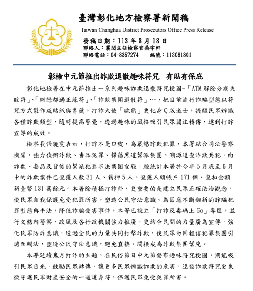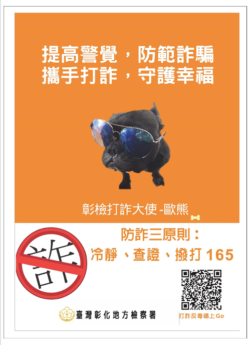 最新公告 彰化地方檢察署113年「反詐騙宣導」! 歷史訊息 | 發布日期: 2024/08/19~2024/09/19 | 瀏覽人數: 75人 | 聯絡資訊: 政風室 04-8520149 為利於民眾獲取相關反詐騙之資訊,彰化地方檢察署全球資訊網設置「打詐反毒碼上 GO」專區,民眾透過掃碼方式即能快速進入獲取相關訊息,內容包含法規、宣導影音、Podcast、宣導成果及相關連結,利於聽讀,也期許民眾也將反詐訊息分享身邊親友,提醒大家對詐騙之警覺,一起成為行動種子。