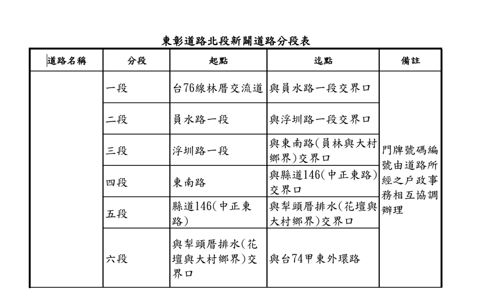 最新公告 公告「東彰道路北段新闢道路」核定命名為「東彰北路」並劃分為六段~ 歷史訊息 | 發布日期: 2024/12/31~2025/01/31 | 瀏覽人數: 827人 | 聯絡資訊: 民政課 04-8520149 公告~有關「東彰道路北段新闢道路」業經彰化縣政府於113年12月19日核定命名為「東彰北路」並劃分為六段。
