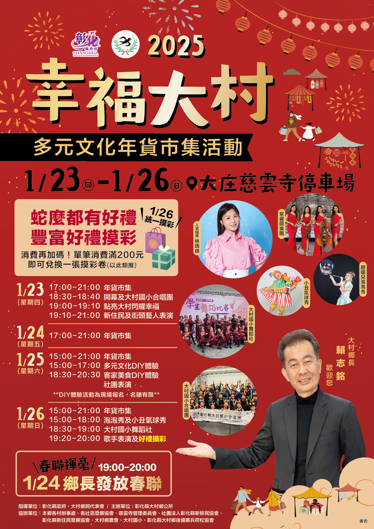 最新公告 🧧2025蛇年點亮大村閃耀幸福🧧 歷史訊息 | 發布日期: 2025/01/20~2025/02/20 | 瀏覽人數: 451人 | 聯絡資訊: 民政課 04-8520149 盛事隆重登場!✨ 盛事隆重登場!✨2025年1月23日至1月26日,為期4天,匯聚新春年味、地方民藝與超人氣美食,民眾必打卡的過年亮點市集即將引爆!每天都有不一樣的活動!✨活動地點:大村慈雲寺停車✔蛇麼都有好禮,豐富好禮摸彩✔ 匯聚多元文化表演與特色嘉年華表演!•年節氛圍的創意美食,讓大家的味蕾一起迎接新年!讓我們一起共襄盛舉,帶來不一樣的新春假期🧨🧨