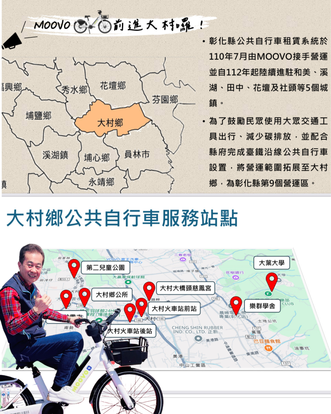 最新公告 🎊『MOOVO 共享自行車🚲進駐大村』囉🎊 歷史訊息 | 發布日期: 2025/03/20~2025/04/20 | 瀏覽人數: 300人 | 聯絡資訊: 建 04-8520149 MOOVO 共享自行車🚲據點在大村鄉共設立了 8 個站點,涵蓋交通、教育、宗教與休閒等重要據點。8個 MOOVO 共享自行車站點💕分別位於:🌠 • 大村火車站前站 • 大村火車站後站 • 大村鄉公所 • 慈雲寺 • 大村第二兒童公園 • 大葉大學 • 樂群學舍 • 大橋慈鳳宮💕大村鄉以「幸福大村」、「健康大村」為發展主軸,以MOOVO🚲據點公所將規劃自行車🚲地圖🌴,帶領大家深入社區、觀光果園與特色景點,促進對大村的認識與行銷。💕期待未來讓我們一起騎上 MOOVO🚲,自由穿梭於大村的街道與田野間,感受這片土地的美好與魅力。期待您的參與,讓我們共同推動低碳生活,打造幸福、健康的大村!🫰