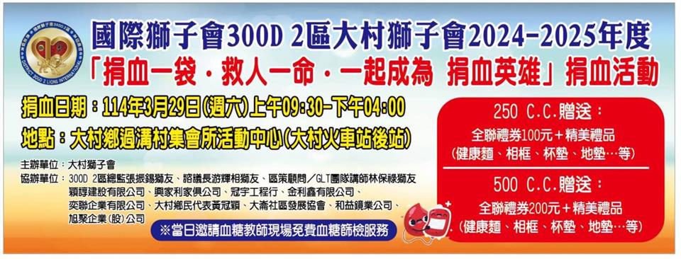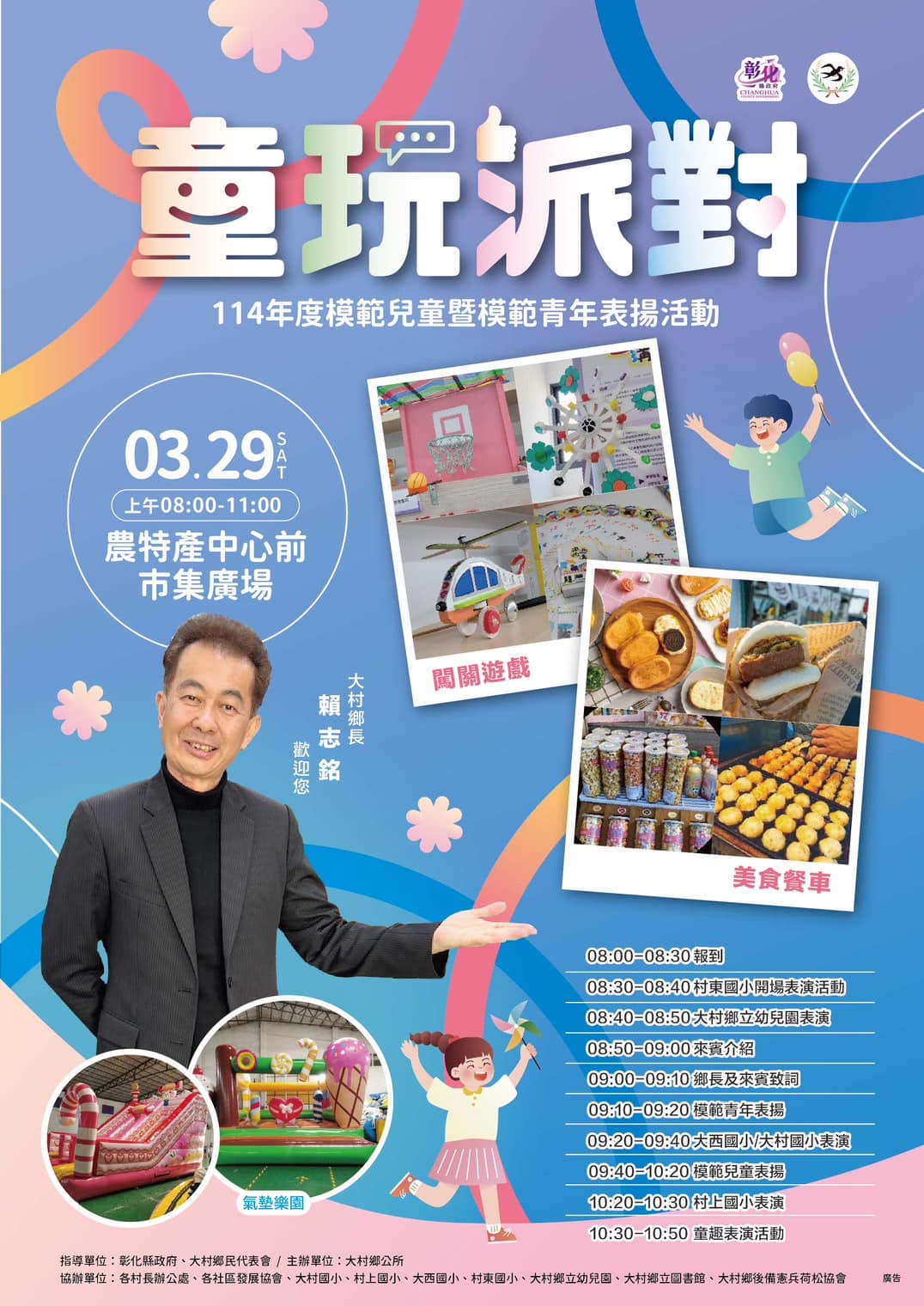 最新公告 🎊童玩派對熱鬧登場🎊 -- 🎉兒童模範生暨優秀青年表揚活動🎉 歷史訊息 | 發布日期: 2025/03/24~2025/04/24 | 瀏覽人數: 220人 | 聯絡資訊: 社政課 04-8520149 🏵大村鄉一年一度的童玩派對兒童模範生暨優秀青年表揚活動,將於3 月 29 日熱鬧登場!現場不僅有最受小朋友喜愛的溜滑梯氣墊🎪還有餐車市集帶來各式美食,讓大小朋友都能玩得開心、吃得滿足。此外,大村獅子會也特別舉辦捐血活動💞,邀請大家一起做愛心,為社會貢獻一份力量。這次活動除了豐富的童玩設施🎼最重要的是要表揚在學業、品行、才藝等方面表現優異的模範生,以及對社會有貢獻、展現正能量的優秀青年。他們是我們社會的未來,希望透過這次表揚,讓大家看到努力的價值,也鼓勵更多年輕人發揮所長、回饋社會。🥁誠摯邀請鄉親們一起來共襄盛舉,帶著家人來玩童玩、品嚐美食,還可以一起參與公益活動,度過一個充滿歡笑與感動的美好假日!活動資訊: 日期: 2025 年 3 月 29 日(六) 地點:大村後火車站(農特產中心前市集廣場)時間:早上8:00-11:00期待與大家相見!期待與大家相見!