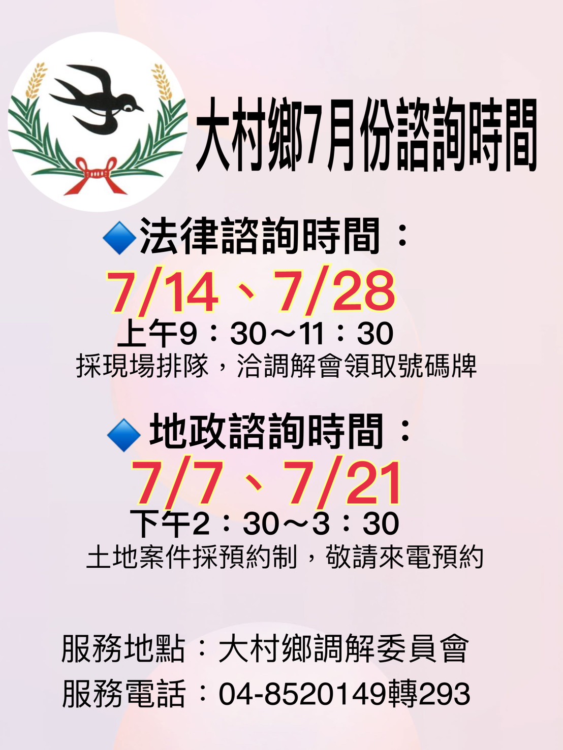 最新公告 👋114年7月份法律及地政諮詢時間👋 歷史訊息 | 發布日期: 2025/06/24~2025/07/24 | 瀏覽人數: 74人 | 聯絡資訊: 民政課 04-8520149 ☎️法律諮詢7/14、7/28星期一 上午9:30-11:30碩成國際法律事務所 陳忠儀律師及廖慧儒律師輪流⏰地政諮詢7/7、7/21星期一 下午2:30-3:30♥️本鄉調解委員會 賴正勲委員🕕諮詢地點:大村鄉調解委員會(大村鄉中正西路336號)💡