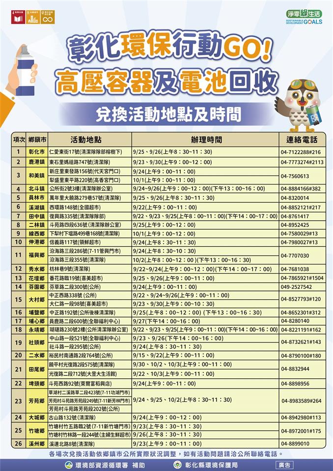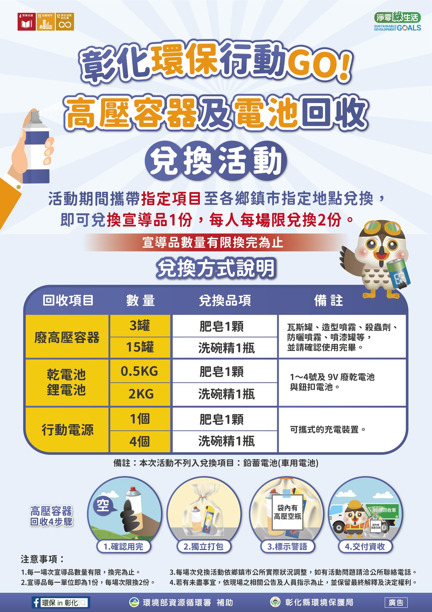 最新公告 🌟彰化環保行動GO.高壓容器及電池回收兌換活動 🌟 歷史訊息 | 發布日期: 2025/09/08~2025/10/08 | 瀏覽人數: 511人 | 聯絡資訊: 清潔隊 04-8520149 彰化縣環保局聯合各鄉鎮市清潔隊,推出「資源回收兌換活動」囉!帶指定回收物來,就能換好禮,一起守護環境 活動日期:9月15日起至10月3日 回收項目:#廢乾電池、#廢高壓容器、#鋰電池、#鈕扣型電池、 參加方式: 查詢本篇活動場次及地點 攜帶符合數量的回收物至指定地點 當場兌換精美宣導品 回收項目與兌換標準 #廢乾電池、#鋰電池、#鈕扣型電池 0.5kg(含)以上 #廢高壓容器 3瓶(含)以上 #廢行動電源 1個(含)以上 溫馨提醒 廢電池與高壓容器務必分類回收,切勿丟入垃圾車,以免發生爆炸危險 廢電池與鋰電池請分開貯存,降低風險 本次兌換活動不收 #鉛蓄電池(車用電池) 你的一小步,就是環保的一大步!快揪親友一起來做環保、換好禮 注意事項 每人每場限兌換2份,#不得代領 若有疑問,請洽各場次承辦鄉鎮市公所 宣導品數量有限,送完為止,敬請見諒