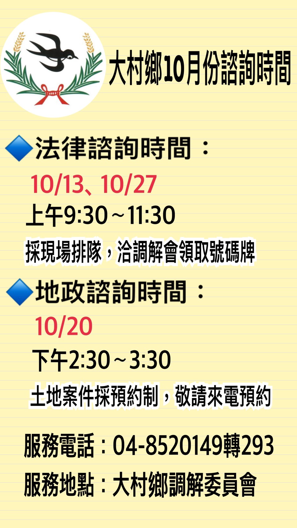 最新公告 🎯114年10月份法律及地政諮詢時間🕰 發布日期: 2025/09/30~2025/10/30 | 瀏覽人數: 49人 | 聯絡資訊: 民政課 04-8520149 ⌛️法律諮詢10/13、10/27星期一 上午9:30-11:30碩成國際法律事務所 陳忠儀律師及廖慧儒律師輪流⌛️地政諮詢10/20星期一 下午2:30-3:30🛎⌛️本鄉調解委員會 賴正勲委員諮詢地點:大村鄉調解委員會(大村鄉中正西路336號)⚓️