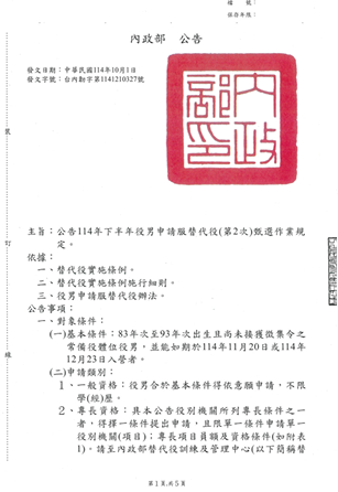 最新公告 內政部「114年下半年役男申請服一般替代役(第2次)甄選作業規定」公告~ 發布日期: 2025/10/08~2025/11/08 | 瀏覽人數: 18人 | 聯絡資訊: 民政課 04-8520149 內政部「114年下半年役男申請服一般替代役(第2次)甄選作業規定」公告