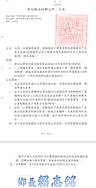 最新公告 公告「公業賴恩義堂」變動後派下現員名冊及變動後派下全員系統表(含變動部分派下現員名冊及變動部分派下員系統表)等,徵求異議。 發布日期: 2025/10/22~2025/11/22 | 瀏覽人數: 27人 | 聯絡資訊: 民政課 04-8520149 依據: 一、祭祀公業條例第18條及憲法法庭112年憲判字第1號判決。 二、「公業賴恩義堂」繼承變動申請人賴添丁君、賴泉鎮君、賴保卿君、賴春炎君及賴晉新君114年07月03日申請書及114年07月08日、114年10月08日補正書及附件。公告事項: 一、本公告係依申請人之申請代為公告,內容如有不實情事,概由申請人負責。 二、本次公告內容變動部分為依祭祀公業條例第18條辦理派下員賴明良等223人之姓名更改或住址異動、派下權繼承變動及依憲法法庭112年憲判字第1號判決補列派下員等事宜;另貴公業變動後派下現員合計為448名。 三、茲將「公業賴恩義堂」變動後派下現員名冊及變動後派下全員系統表等資料陳列於後(張貼公告欄用)或業經張貼於本所及大橋村辦公處之公布欄,並於本所網站刊登公告文30日。 四、派下員或利害關係人對於是項公告資料,如認有錯誤或遺漏,應於公告之日起30日內以書面連同證明文件向本所提出異議;屆期如無人提出異議,則由本所依規定准予備查。 五、公告期間:自114年10月22日起至114年11月21日止。