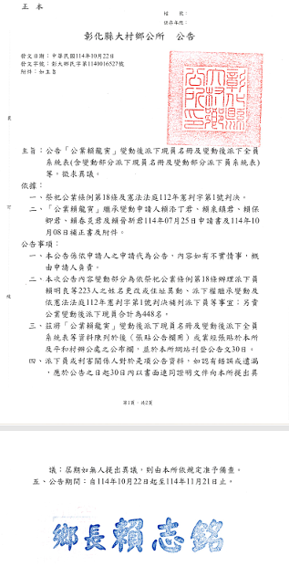 最新公告 公告「公業賴龍寅」變動後派下現員名冊及變動後派下全員系統表(含變動部分派下現員名冊及變動部分派下員系統表)等,徵求異議。 發布日期: 2025/10/22~2025/11/22 | 瀏覽人數: 19人 | 聯絡資訊: 民政課 04-8520149 依據: 一、祭祀公業條例第18條及憲法法庭112年憲判字第1號判決。 二、「公業賴龍寅」繼承變動申請人賴添丁君、賴泉鎮君、賴保卿君、賴春炎君及賴晉新君114年07月25日申請書及114年10月08日補正書及附件。公告事項: 一、本公告係依申請人之申請代為公告,內容如有不實情事,概由申請人負責。 二、本次公告內容變動部分為依祭祀公業條例第18條辦理派下員賴明良等223人之姓名更改或住址異動、派下權繼承變動及依憲法法庭112年憲判字第1號判決補列派下員等事宜;另貴公業變動後派下現員合計為448名。 三、茲將「公業賴龍寅」變動後派下現員名冊及變動後派下全員系統表等資料陳列於後(張貼公告欄用)或業經張貼於本所及平和村辦公處之公布欄,並於本所網站刊登公告文30日。 四、派下員或利害關係人對於是項公告資料,如認有錯誤或遺漏,應於公告之日起30日內以書面連同證明文件向本所提出異議;屆期如無人提出異議,則由本所依規定准予備查。五、公告期間:自114年10月22日起至114年11月21日止。