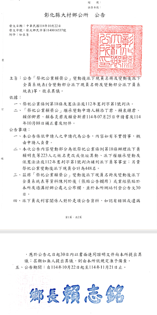 最新公告 公告「祭祀公業賴榮公」變動後派下現員名冊及變動後派下全員系統表(含變動部分派下現員名冊及變動部分派下員系統表)等,徵求異議。 發布日期: 2025/10/22~2025/11/22 | 瀏覽人數: 39人 | 聯絡資訊: 民政課 04-8520149 依據: 一、祭祀公業條例第18條及憲法法庭112年憲判字第1號判決。 二、「祭祀公業賴榮公」繼承變動申請人賴添丁君、賴泉鎮君、賴保卿君、賴春炎君及賴晉新君114年07月25日申請書及114年10月08日補正書及附件。公告事項: 一、本公告係依申請人之申請代為公告,內容如有不實情事,概由申請人負責。 二、本次公告內容變動部分為依祭祀公業條例第18條辦理派下員賴明良等223人之姓名更改或住址異動、派下權繼承變動及依憲法法庭112年憲判字第1號判決補列派下員等事宜;另貴祭祀公業變動後派下現員合計為448名。 三、茲將「祭祀公業賴榮公」變動後派下現員名冊及變動後派下全員系統表等資料陳列於後(張貼公告欄用)或業經張貼於本所及過溝村辦公處之公布欄,並於本所網站刊登公告文30日。 四、派下員或利害關係人對於是項公告資料,如認有錯誤或遺漏,應於公告之日起30日內以書面連同證明文件向本所提出異議;屆期如無人提出異議,則由本所依規定准予備查。 五、公告期間:自114年10月22日起至114年11月21日止。