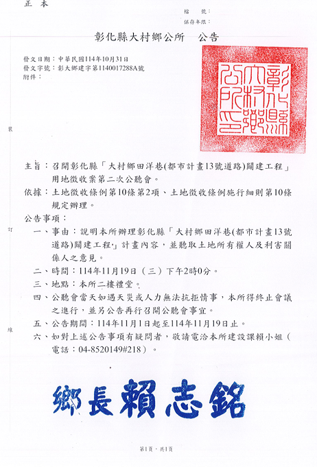最新公告 彰化縣「大村鄉田洋巷(都市計畫13號道路)闢建工程」用地徵收案第二次公聽會。 發布日期: 2025/11/03~2025/12/04 | 瀏覽人數: 49人 | 聯絡資訊: 建設課 04-8520149 依土地徵收條例第10條第2項及土地徵收條例施行細則第10 條規定辦理。