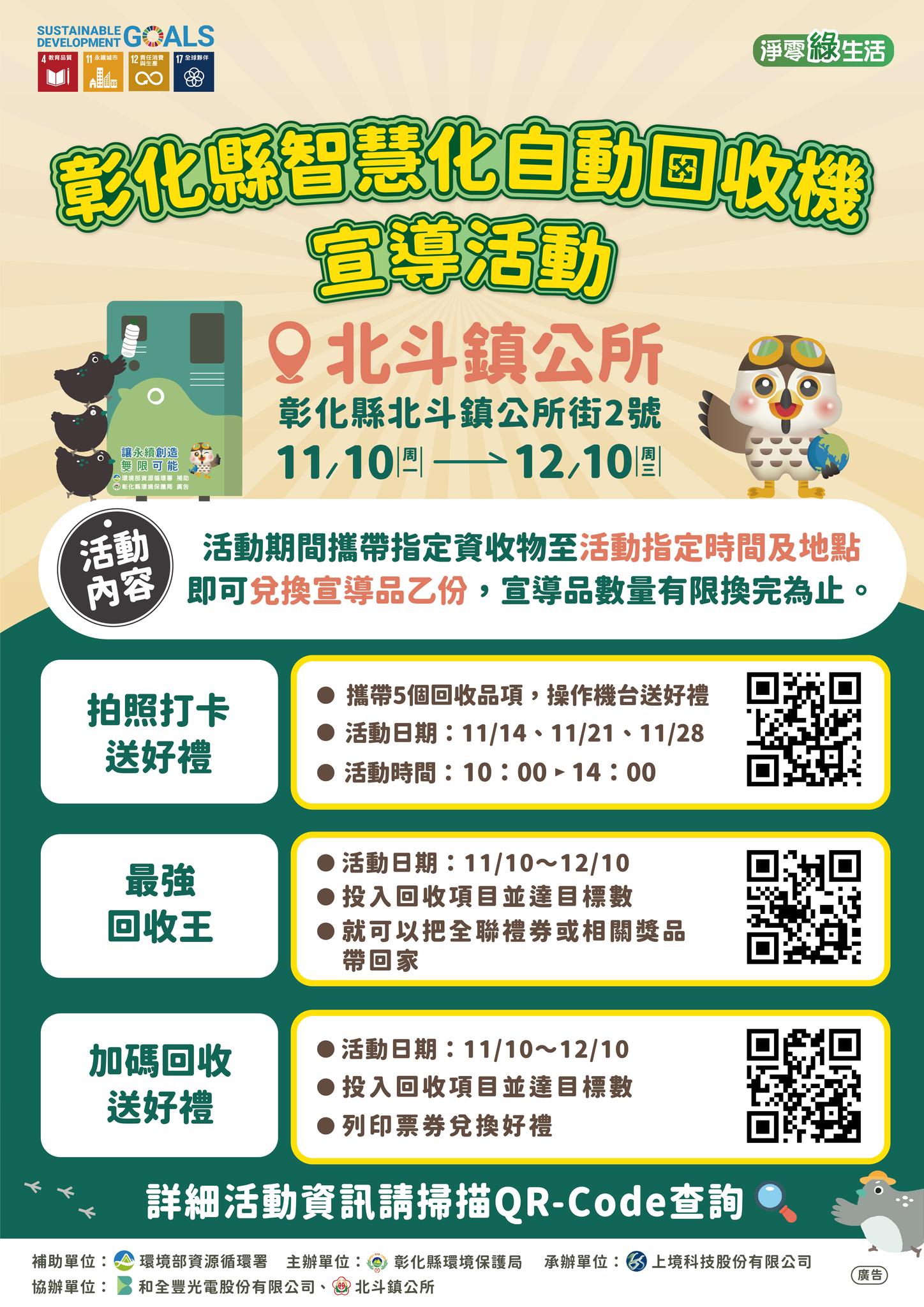 最新公告 彰化縣智慧化自動回收機宣導活動👈 發布日期: 2025/11/04~2025/12/04 | 瀏覽人數: 62人 | 聯絡資訊: 清潔隊 04-8520149 我們讓資源回收分類變得更聰明環保局於 #北斗鎮公所 設置智慧化自動回收機這台機器可以回收 #寶特瓶 #鋁罐 及 #乾電池只要在活動期間來參加,就可以把獎品帶回家囉本次共有3項活動【活動】#拍照打卡送好禮 【活動】#最強回收王【活動】#加碼回收送好禮詳細內容請掃描圖卡上面的QR Code或 #留言區 查閱有好多的內容及好康,請大家告訴大家讓永續創造無限可能, #改造彰化Continue#智慧化自動回收機 #碳竹雞 #SDGs4優質教育 #SDGs11永續城鄉#SDGs12責任消費及生產 #SDGs17全球夥伴#堅持做對的事 #做應該做的事 #做對彰化有利的事#淨零綠生活 #環境部資源循環署 #彰化縣環境保護局