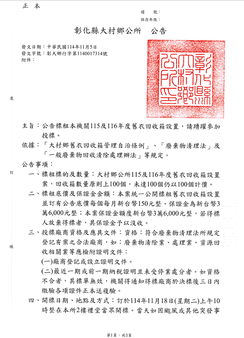 最新公告 公告標租本機關115及116年度舊衣回收箱設置,請踴躍參加投標。 發布日期: 2025/11/05~2025/12/05 | 瀏覽人數: 53人 | 聯絡資訊: 行政課 04-8520149 依據「大村鄉舊衣回收箱管理自治條例」、「廢棄物清理法」及「一般廢棄物回收清除處理辦法」等規定。