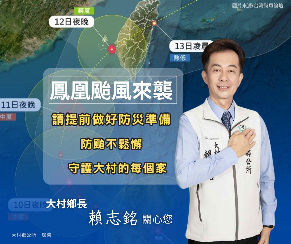 最新公告 🌀 鳳凰颱風即將來襲,請鄉親朋友提高警覺! 發布日期: 2025/11/10~2025/12/10 | 瀏覽人數: 51人 | 聯絡資訊: 民政課 04-8520149 為了守護家園安全,請大家提前做好防颱準備: 清理住家周圍排水溝,保持暢通、避免積水。 固定陽台花盆、遮雨棚、招牌等容易被風吹落的物品。 檢查手電筒、電池、食物及飲用水等備用品是否充足。 外出時請留意強風豪雨,避免靠近樹木與施工圍籬。 🌧 防颱不鬆懈 守護大村的每個家 大村鄉長 賴志銘 關心您