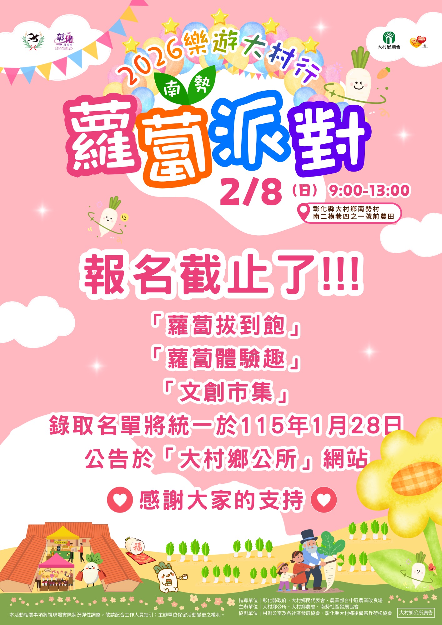 最新公告 2026樂遊大村行-南勢蘿蔔派對 🎉報名太踴躍已截止啦! 發布日期: 2026/01/05~2026/02/05 | 瀏覽人數: 57人 | 聯絡資訊: 農發所 04-8529583 2026樂遊大村行-南勢蘿蔔派對 蘿蔔派對真的超夯 報名太踴躍已截止啦!已截!已截止! 「蘿蔔體驗趣」、「蘿蔔拔到飽」、「文創市集」 活動錄取名單 將於 115年1月28日公告在「大村鄉公所」官網,記得準時上網查看,看看幸運名單有沒有您唷! 期待和大家一起開心拔蘿蔔~ 也謝謝大家對活動的支持