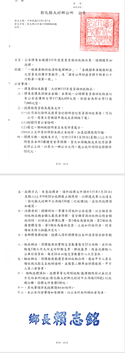 最新公告 公告標售本機關115年度變賣資源回收物品案,請踴躍參加投標。 發布日期: 2026/01/07~2026/02/07 | 瀏覽人數: 19人 | 聯絡資訊: 行政課 04-8520149 依據「一般廢棄物回收清除處理辦法」、「各機關奉准報廢財產之變賣及估價作業程序」及「國有公用財產管理手冊第六十六點第一項第一款」。