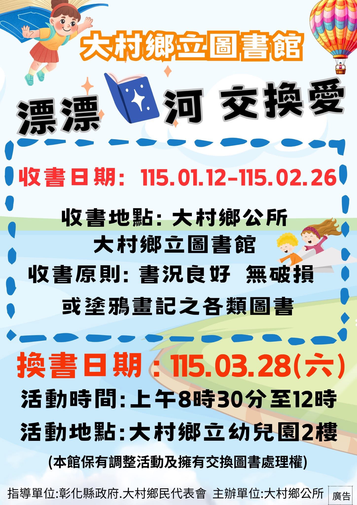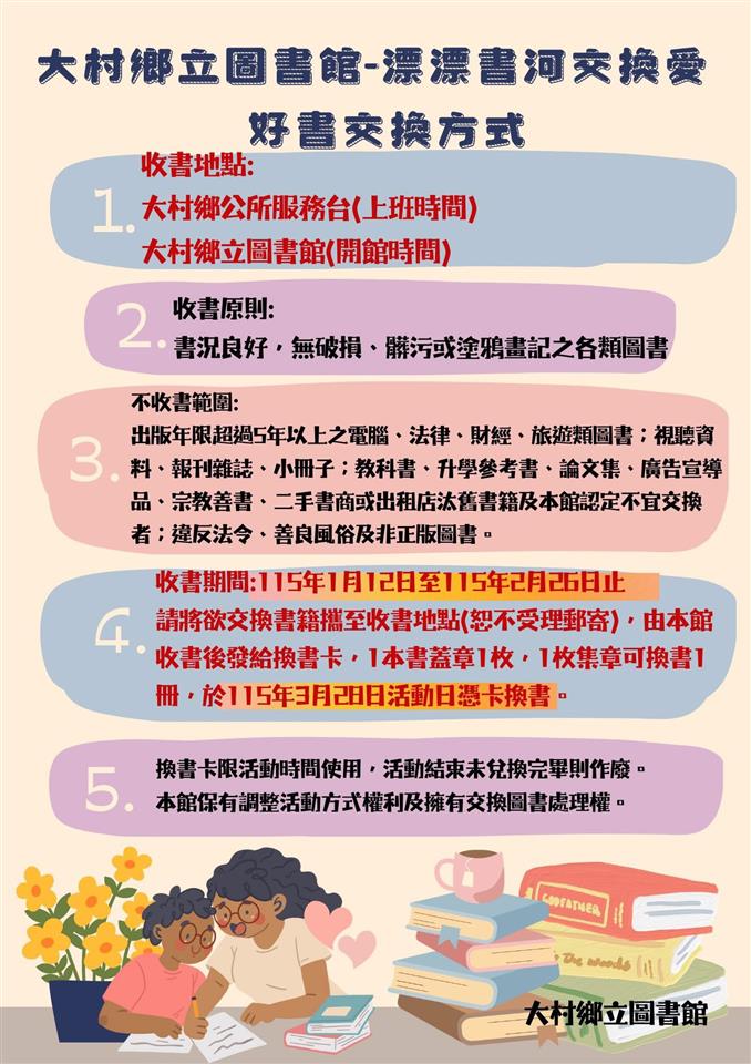 親子活動 👍漂漂書河交換愛👍 發布日期: 2026/01/12~2026/02/12 | 瀏覽人數: 57人 | 聯絡資訊: 圖書館 04-8527405 活動名稱:漂漂書河交換愛 收書期間:115.01.12-115.02.26 收書地點: 大村鄉公所服務台(上班時間) 大村鄉立圖書館(開館時間) 換書日期:115.03.28(六)上午8:30至12:00 活動地點:大村鄉立幼兒園2樓 你有多久沒有翻閱書櫃裡曾經心動不已的書了呢? 又有多久找不到一本能夠讓你感動落淚的書了呢? 曾引起悸動的書本,正靜靜的躺在家裡的某一個角落,他們或許因身上的積塵感到寂寞,也或許在回味當年讓你滿腔澎湃的時光。 每一本書,都有存在的意義,他們曾為我們帶來回憶中一段段美好,那麼,我們是不是能夠將這些美麗的書籍挑選出來,讓他們成為另一個陌生人的心靈悸動呢? 讓我們創造一條充滿愛的書河,讓心愛的書籍隨著書河漂流進其他愛書人的家,閱讀是場尋寶之旅,透過分享與交換,可以更加開闊人生的視野,也期許每一位讀者都能在這條漂漂書河中,找到那本專屬於你的感動與收穫!