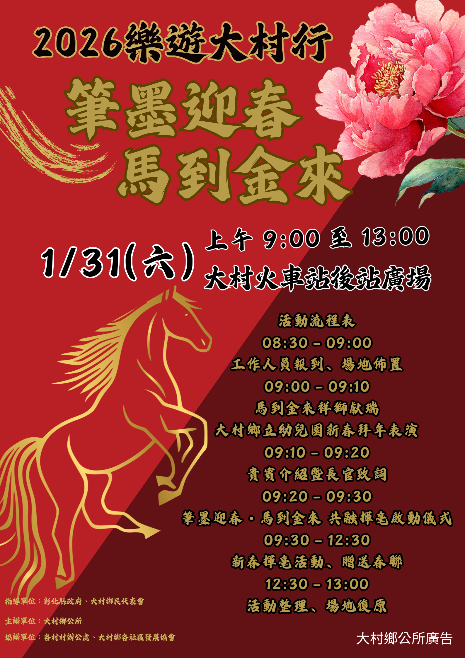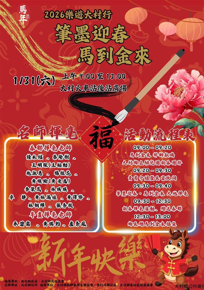 年度活動 🐎 筆墨迎春 馬到金來 🐎名師揮毫✍️ 發布日期: 2026/01/15~2026/02/15 | 瀏覽人數: 56人 | 聯絡資訊: 行政課 04-8520149 🧧新春到,幸福大村跟你一起過好年 🧧🐎 筆墨迎春 馬到金來 🐎名師揮毫✍️今年大村好熱鬧~從 祥獅獻瑞、幼兒園孩子的新春拜年表演,到 駐鄉藝術家協會老師和小朋友一起揮毫寫春聯,滿滿祝福免費帶回家,#春聯可回家 🎉📅 1/31(六)早上 9:00~13:00📍 火車站後站廣場帶上家人朋友,一起來搶個好彩頭,感受大村最溫暖、最有年味的新春氣息吧 ❤️🎉