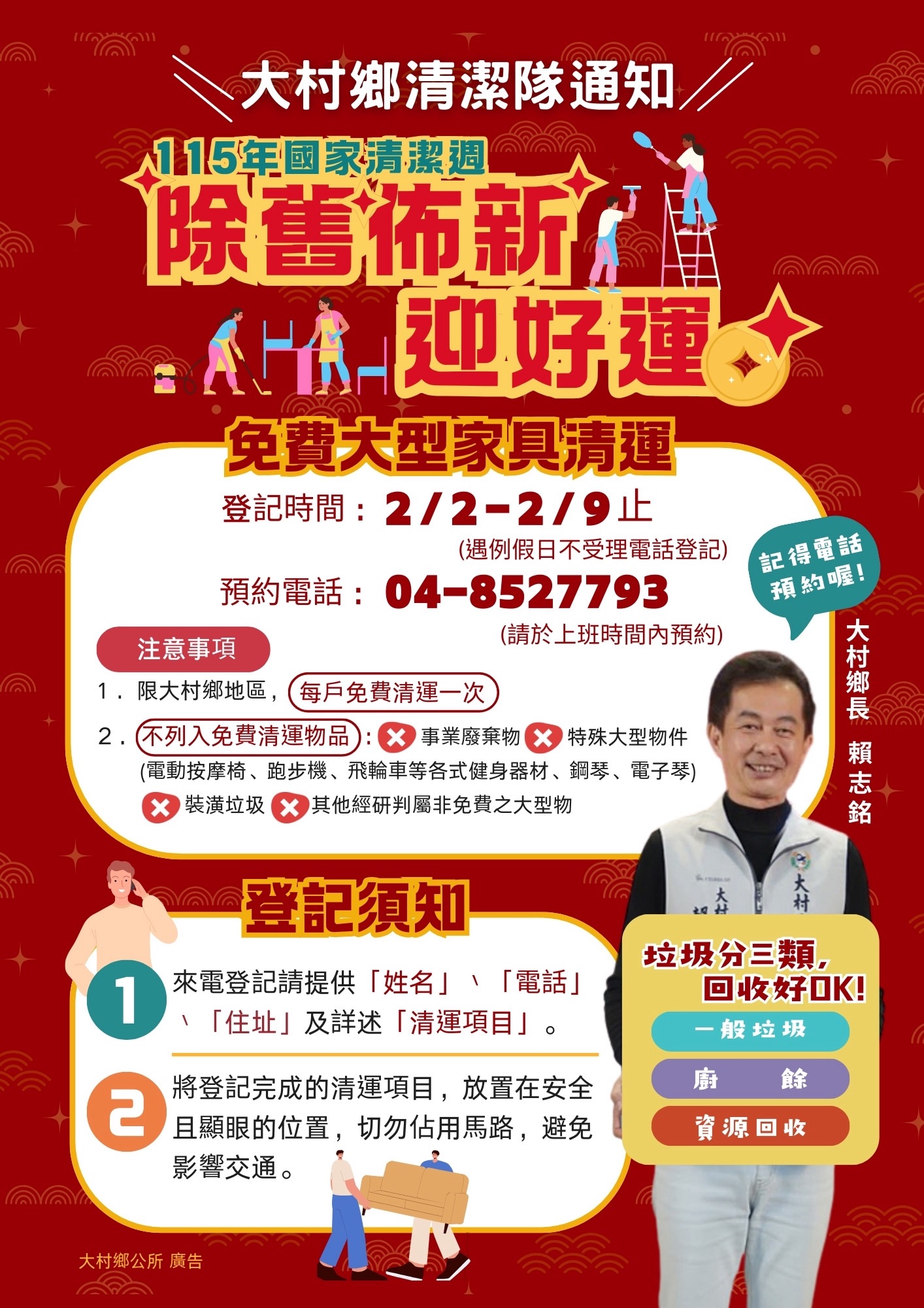 最新公告 🧹✨ 115年國家清潔週開始囉! ✨🧹 發布日期: 2026/02/02~2026/03/02 | 瀏覽人數: 187人 | 聯絡資訊: 清潔隊 04-8527793 115年國家清潔週開始囉! 為了協助鄉親們除舊佈新、迎接嶄新的一年, 清潔隊提供 『免費』大型家具清運服務 🗓 清運時間|2/2-2/9日 預約電話|04-8527793 貼心提醒: ✔ 登記完成之清運項目,請放置於 安全且顯眼的位置 請勿佔用馬路,共同維護交通與用路安全 家中老舊家具、大型廢棄物, 趁現在一次整理, 讓環境更清爽、心情也跟著亮起來 乾淨家園,從你我一起做起 除舊佈新迎好運,一起迎接嶄新的一年 大村鄉長賴志銘 也在這裡祝福所有鄉親 新年快樂、闔家平安、萬事順心