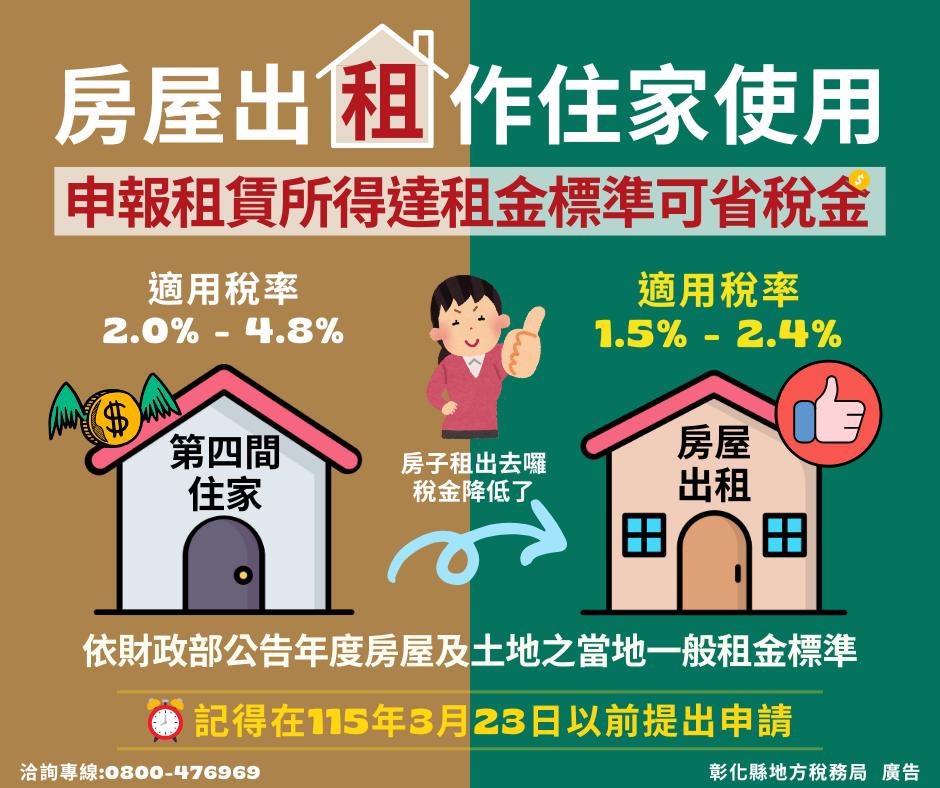 最新公告 房屋稅優惠稅率~訊息宣導! 發布日期: 2026/02/23~2026/03/23 | 瀏覽人數: 36人 | 聯絡資訊: 財政課 04-8520149 出租房屋供住家使用且申報租賃所得達租金標準,可申請適用房屋稅優惠稅率,於115年3月23日前提出申請,當期即適用。