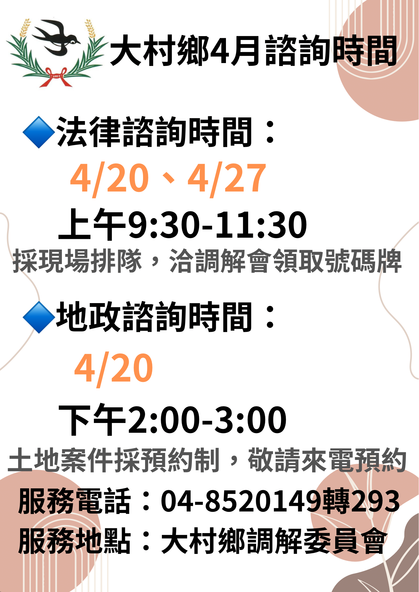 最新公告 💥115年4月份法律及地政諮詢時間💥 發布日期: 2026/03/30~2026/04/30 | 瀏覽人數: 16人 | 聯絡資訊: 民政課 04-8520149 法律諮詢4/20、4/27星期一 上午9:30-11:30⏰碩成國際法律事務所 陳忠儀律師及廖慧儒律師輪流地政諮詢4/20星期一 下午2:00-3:00⏰⏳本鄉調解委員會 賴正勲委員⏳諮詢地點:大村鄉調解委員會(大村鄉中正西路336號) 連絡電話:04-8520149分機293