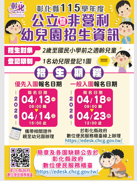 最新公告 大村鄉立幼兒園 115學年度招生簡章公告💕 發布日期: 2026/03/31~2026/04/30 | 瀏覽人數: 26人 | 聯絡資訊: 幼兒園 04-8520149 📌目前「尚未開放報名」🖥️報名方式:採「線上報名」【彰化縣政府數位便民櫃台網站】https://edesk.chcg.gov.tw/📅報名時間:依縣府招生簡章公告為準⭐不會操作線上報名的家長歡迎到幼兒園,我們可提供現場協助呦😊~~📞洽詢電話:04-8531799