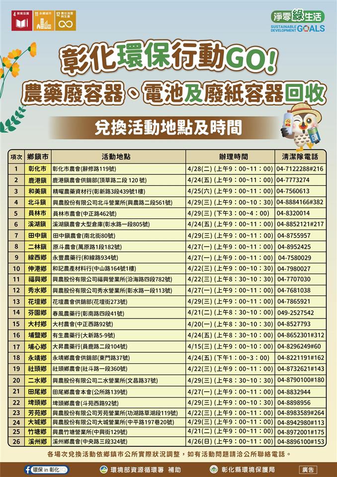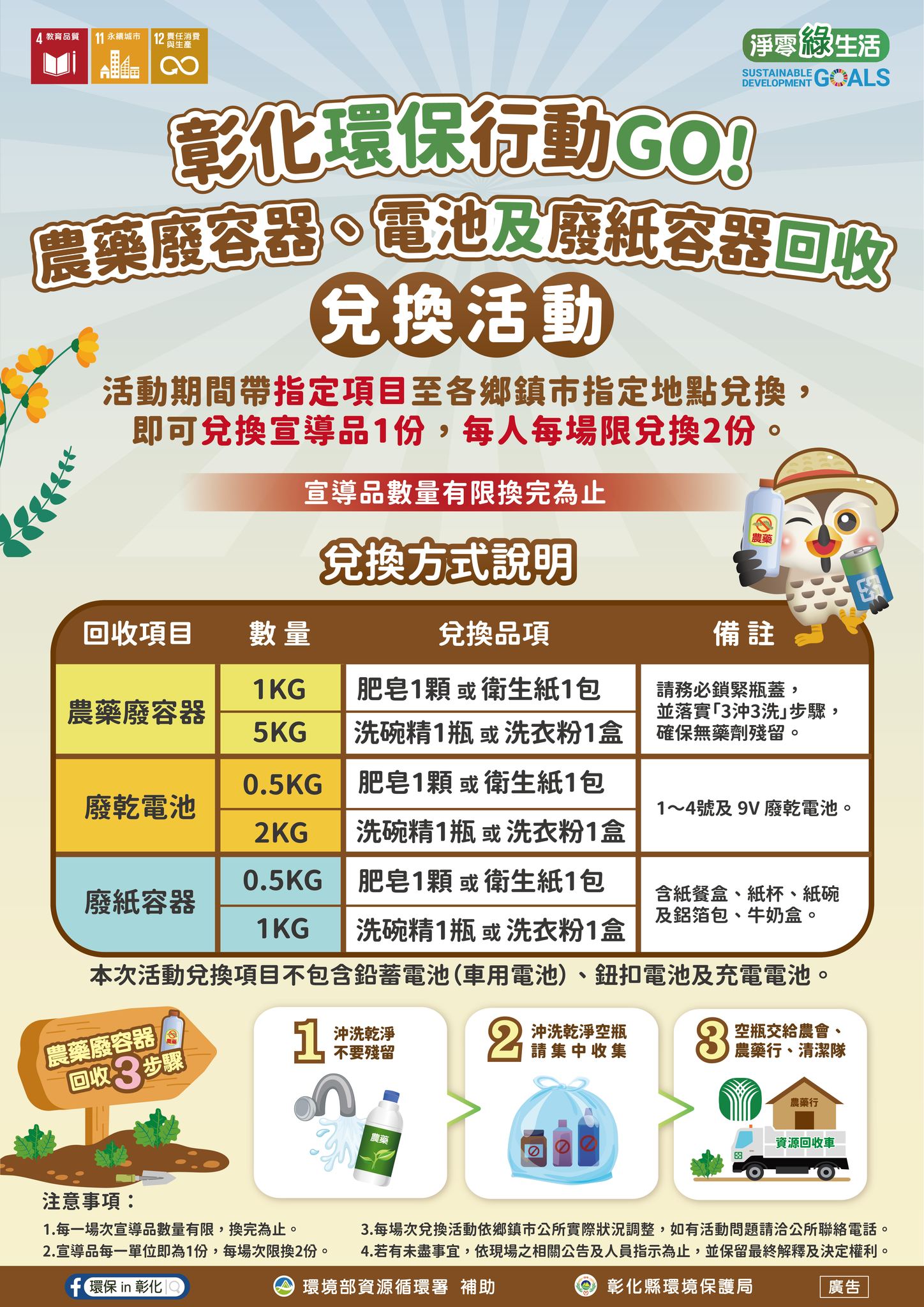 最新公告 【彰化環保行動GO!一起回收換好禮】🌱 發布日期: 2026/04/16~2026/05/16 | 瀏覽人數: 56人 | 聯絡資訊: 清潔隊 04-8520149 家中有用完的農藥容器、廢電池或廢紙容器嗎?別丟掉!帶來回收還可以換實用好禮 活動期間(((第1週期)))只要攜帶「指定回收項目」到各鄉鎮市指定地點即可兌換宣導品1份(每人每場限兌換2份) 回收項目包含: 農藥廢容器(記得沖洗乾淨喔!) 廢乾電池 廢紙容器 兌換好禮:肥皂、衛生紙、洗碗精、洗衣粉 小提醒 宣導品數量有限,以現場提供為主,換完為止 農藥容器請務必「3沖3洗」確保無殘留 本次不包含:鉛蓄電池(車用電池)、鈕扣電池及充電電池。一起用行動守護環境讓資源循環再利用,為地球盡一份心力