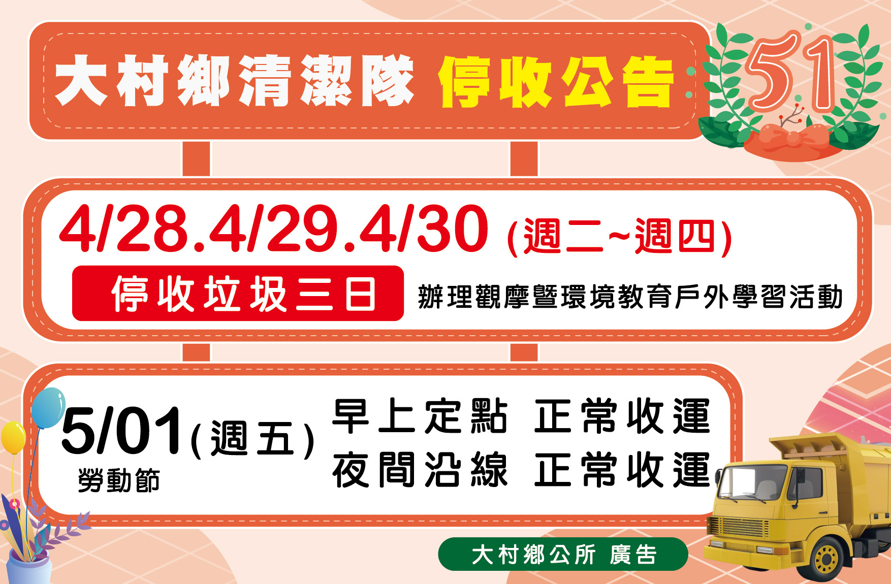 最新公告 垃圾停收通知 發布日期: 2026/04/20~2026/05/20 | 瀏覽人數: 19人 | 聯絡資訊: 清潔隊 04-8520149 清潔隊定於4月28.29.30日(週二至週四)辦理隊員資源回收觀摩暨環境教育戶外學習活動,活動期間停收垃圾三日,並於隔日5/1(週五)勞動節加班收運垃圾。