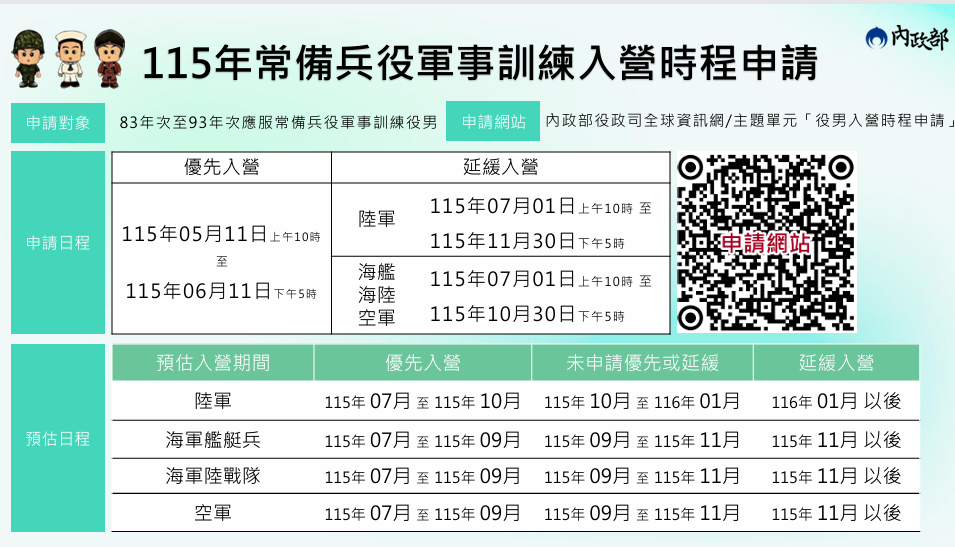 最新公告 內政部「115年應接受常備兵役軍事訓練役男(83年次至93年次),申請優先入營、延緩入營之對象條件及相關作業規定」公告! 發布日期: 2026/04/15~2026/05/20 | 瀏覽人數: 24人 | 聯絡資訊: 民政課 04-8520149 鑑於教育學制因素,每年6月適逢學校畢業季,同時眾多役男等待服役,惟依國防部新兵訓練中心各梯次訓量,必須分批安排役男入營。為瞭解役男可入營時段及配合國軍新兵訓練容量,爰依役男入營緩急需求區分為「優先入營」、「未申請優先或延緩入營」及「延緩入營」3種,供役男擇一申請,俾妥適生涯規劃。內政部已於役政司全球資訊網(首頁/主題單元項下)建置「役男入營時程申請系統」,以利掌握入營時程,申請期間如下:(一)優先入營:自115年5月11日(星期一)上午10時起至115年6月11日(星期四)下午5時止。(二)延緩入營:自115年7月1日(星期三)上午10時起至115年11月30日(星期一)下午5時止。