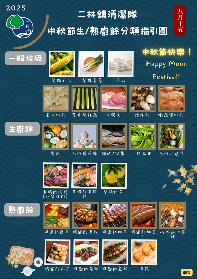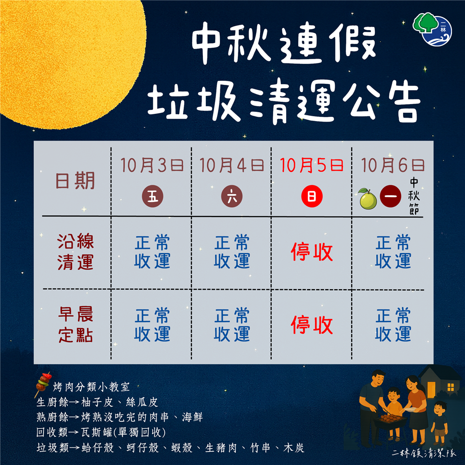 最新公告 中秋節連假正常清運公告 發布日期: 2025/09/25~2025/10/06 | 瀏覽人數: 106人 | 聯絡資訊: 洪小姐 8969906分機205 10/3(五)、10/4(六)、10/6(一)沿線清運及早晨定點皆維持正常服務喔!10/5(日) 為例假日停收。中秋佳節就要到啦!大家是不是已經準備好烤肉、吃月餅、賞月亮了呢?過節的同時,咱們也別忘了做好回收分類🚩烤肉分類小教室生廚餘→柚子皮、絲瓜皮熟廚餘→烤熟沒吃完的肉串、海鮮回收類→瓦斯罐(單獨回收)垃圾類→蛤仔殼、蚵仔殼、蝦殼、生豬肉、竹串、木炭想了解更詳細些,可以看海報內容哦大家一起動手做分類,減少垃圾更環保~祝鄉親們,中秋快樂!闔家平安團圓 💕#中秋清運 #中秋節快樂