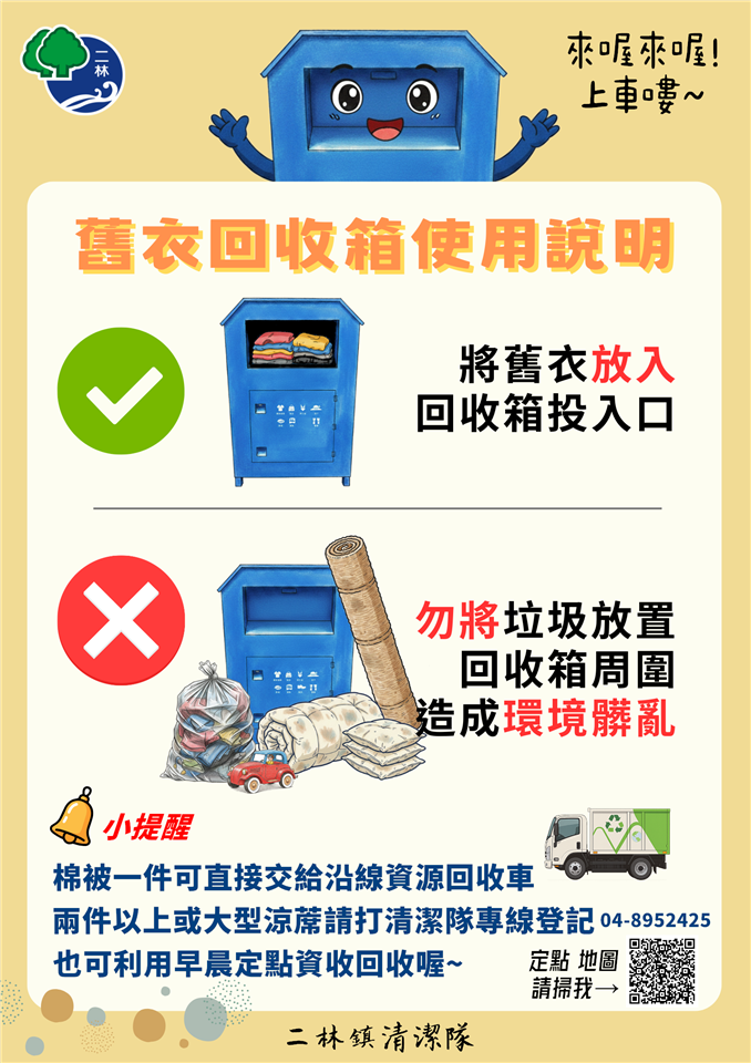 最新公告 《舊衣回收箱使用說明》 發布日期: 2025/12/26~2026/06/26 | 瀏覽人數: 21人 | 聯絡資訊: 洪小姐 8969906分機205 【舊衣回收小撇步!來喔來喔~ 👕💙】大家最近有在整理衣櫃嗎?淘汰的舊衣記得要「投對地方」,環境才不會亂糟糟喔! ✅ 正確做法: 請將舊衣物,確實放入回收箱的「投入口」內。 ❌ 錯誤示範: 絕對不可以把衣物、垃圾隨意堆放在回收箱周圍,這樣會造成環境髒亂,也會讓辛苦的清潔隊員很困擾喔!‼️敬請民眾發揮公德心,請勿隨意翻動或拆開舊衣回收箱外已妥善打包之舊衣,以免造成環境髒亂,影響市容與後續清運作業。🔔 特別小提醒(關於棉被): 家裡的舊棉被、枕頭、涼蓆、椰子床不能丟進舊衣回收箱喔!也可多多利用早晨定點資收回收~1件棉被: 請直接交給沿線的資源回收車。2件以上或大型涼蓆/其他: 請先撥打清潔隊專線登記預約。📞 清潔隊專線: 04-8952425讓我們一起隨手做環保,守護二林好環境!✨