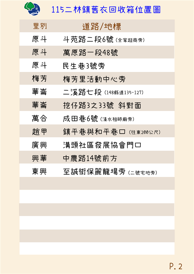 最新公告 歲末大掃除 讓舊衣找到新家,善意循環從「衣」開始! 發布日期: 2026/01/13~2026/02/13 | 瀏覽人數: 36人 | 聯絡資訊: 洪小姐 8969906分機205 歲末大掃除 讓舊衣找到新家,善意循環從「衣」開始!【歲末大掃除 ✨ 讓舊衣找到新家,善意循環從「衣」開始!】春節將近,民眾進行居家環境整理時,舊衣物的清理需求會明顯增加。為鼓勵正確回收、避免隨意棄置造成環境髒亂,特提供本鎮舊衣回收箱設置地點清冊,敬請鄉親多加利用,共同維護社區整潔與美觀。因部分設置點調整,配合實際使用情形1️⃣若里內目前未設置回收箱,可將舊衣交由「早晨定點資源回收車」回收2️⃣少量舊衣,可交給「沿線清運」的資源回收車。3️⃣大量舊衣,歡迎撥打清潔隊服務專線04-8952425,由廠商安排到府協助處理。#舊衣回收減碳加分#回收一件衣物可減少約4公斤碳排放#回收1件T恤更能節省約2500公升水量