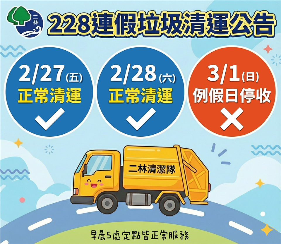最新公告 228連假垃圾清運公告 發布日期: 2026/02/23~2026/03/01 | 瀏覽人數: 35人 | 聯絡資訊: 洪小姐 8969906分機205 【228連假垃圾清運公告】連假期間清運時程:2月27日 (五) —【正常清運】 ✅2月28日 (六) —【正常清運】 ✅3月01日 (日) —【例假日停收】 ❌📍 早晨定點服務: 連假期間,早晨 5 處定點均維持正常服務,若無法配合垃圾車清運時間的民眾,歡迎多加利用。⚠️ 公共安全重要提醒: 為確保垃圾車清運過程之作業安全,防止火警意外發生,敬請鄉親配合: 「金紙及炮竹香灰」丟入垃圾車前,請務必先「以水淋濕」再行丟棄,避免殘餘火星引發危險!一個小動作,讓垃圾車清運更安全!#二林鎮公所 #二林清潔隊 #環境守護 #228連假 #垃圾清運公告 #公共安全