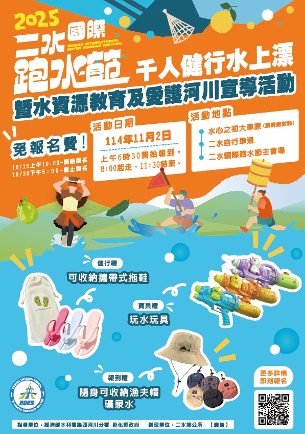 年度活動 2025二水國際跑水節-千人健行水上漂活動 (水資源教育及愛護河川宣導活動) 即將於114年10月15日(三)上午10點開始報名囉!! 發布日期: 2025/10/13~2025/10/31 | 瀏覽人數: 48人 | 聯絡資訊: 何課長 04-8790100分機127 【免費!免費!免費!】【秒殺!秒殺!秒殺!】因為宣導品的CP值太高了,所以特別強調3次喔!2025二水國際跑水節-千人健行水上漂活動(水資源教育及愛護河川宣導活動)即將於114年10月15日(三)上午10點開始報名囉限額1000名,本次報到禮、健行禮及寶貝禮宣導品真的太優質了您一定要來報名參加!本次主題為鼓勵親子同遊二水國際跑水節活動108年1月1日以後出生的小朋友,特別加贈寶貝禮一同了解這項傳統活動深具飲水思源的歷史與意義親身參與下八堡圳玩水的體驗報名網址https://www.beclass.com/m/rid=305017e68e32b2c3f8ba歡迎全國民眾,相招來二水、歡喜來跑水詳細藝人卡司及活動資訊將於二水鄉公所FB粉絲專頁陸續公布#幸福二八水 #一起來二水玩吧#草地音樂會 #跑水之夜晚會