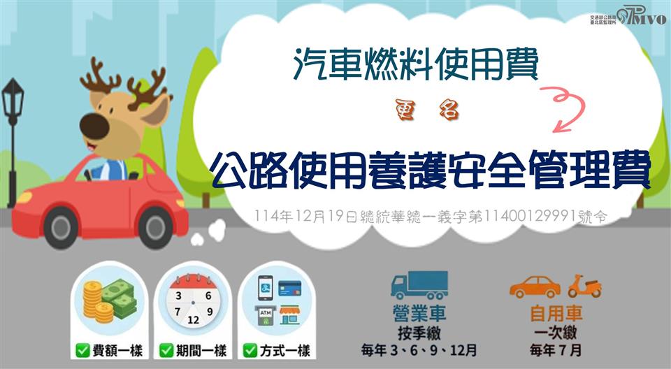 其他資訊 轉知~彰化監理站-『汽車燃料使用費』已正式更名為『公路使用養護安全管理費』 發布日期: 2026/04/16~2026/07/31 | 瀏覽人數: 23人 | 聯絡資訊: 財政課 分機176 一、「交通部公路局『汽車燃料使用費』已正式更名為『公路使用養護安全管理費』(簡稱『公路養管費』或『養管費』),自114年12月19日起實施;新名稱直接反映用途,係用於公路養護、修建及行車安全管理,讓民眾更清楚每筆費用的實際去向。相關制度均維持不變,包括開徵時間、繳納方式及費額標準皆與以往一致。自用車仍於每年7月一次徵收,營業車則按季繳納。二、監理站提醒,逾期未繳將依法處以新臺幣300元以上、3,000元以下罰鍰,經通知仍未繳納者,將移送強制執行。 三、為提升繳費便利性,民眾可透過「監理服務APP」、「監理服務網」https://www.mvdis.gov.tw/m3-emv-fee/fee/fuelFee#gsc.tab=0或行動支付平台(如一卡通Money、街口支付等)線上繳費;亦可申請電子繳款單,即時接收通知。另提醒民眾,監理機關發送之繳費簡訊均以政府專用「111」號碼發送,訊息開頭為接收者手機號碼末3碼及機關名稱。請民眾收到簡訊通知時務必認明「來源號碼111」、「手機末三碼」與「機關具名」三重驗證,才能安心點閱訊息、安全繳納公路養管費。