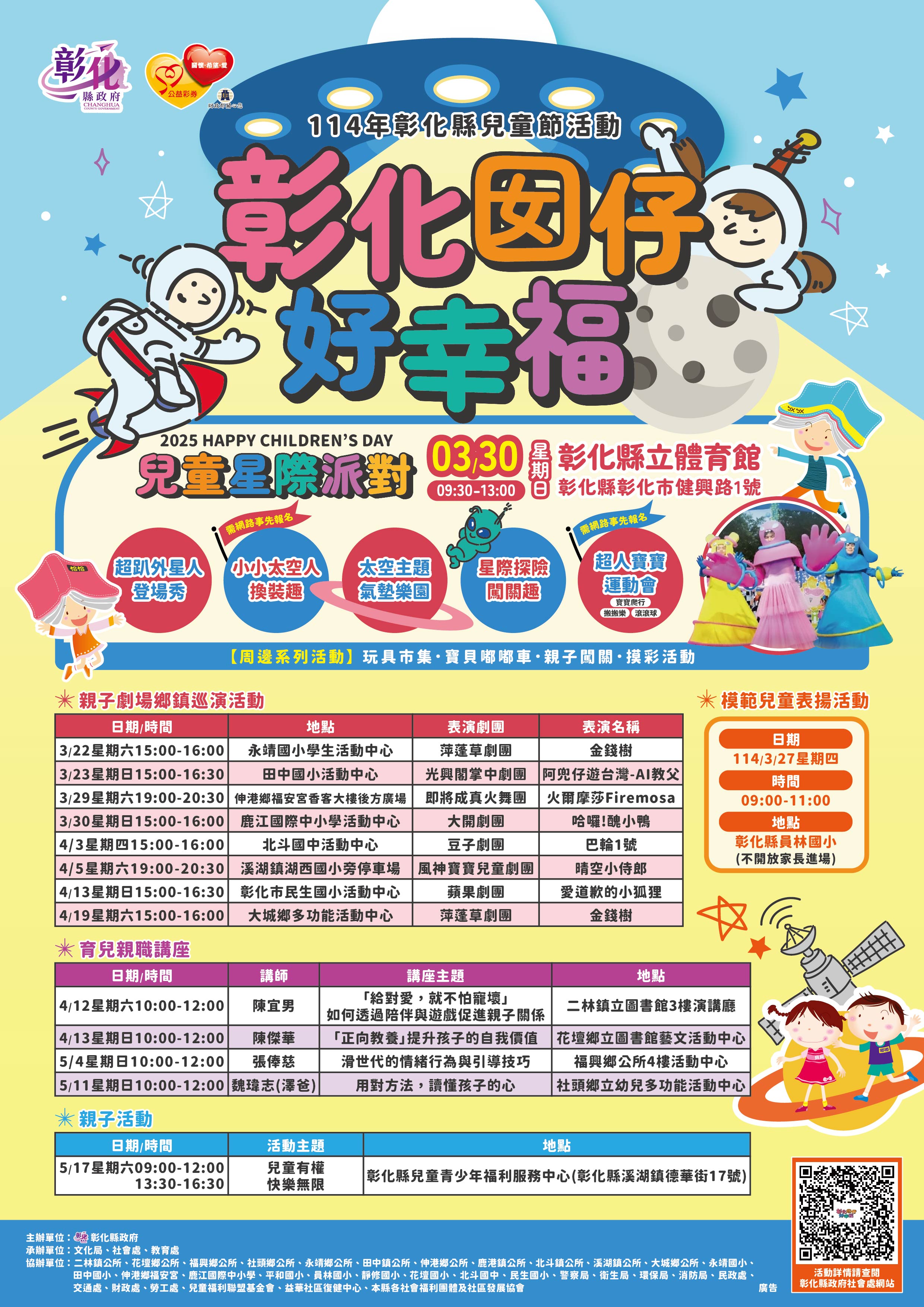 最新公告 【彰化縣政府】為慶祝114年兒童節,彰化縣政府規劃辦理「彰化囡仔好幸福-2025兒童星際派對」活動,於114/3/30(日)歡樂登場! 歷史訊息 | 發布日期: 2025/03/19~2025/04/19 | 瀏覽人數: 131人 活動時間及地點如下:(一)日期:114年3月30日(星期日)上午9時30分至下午1時。(二)地點:彰化縣立體育館(彰化縣彰化市健興路1號)活動內容:「超趴外星人」登場秀、超人寶寶運動會(寶寶爬行、搬搬樂、滾滾球)、太空主題玩樂氣墊、親子手作小小太空人裝、氣球魔術秀、玩具市集、寶貝嘟嘟車、星際探險闖關趣、兒少團體表演等精彩活動及摸彩抽大獎,敬邀民眾同樂。活動訊息請至本府社會處網站/活動訊息專區/114年彰化縣政府「彰化囡仔好幸福」慶祝兒童節系列活動(https://reurl.cc/ZZRY8a)參閱。