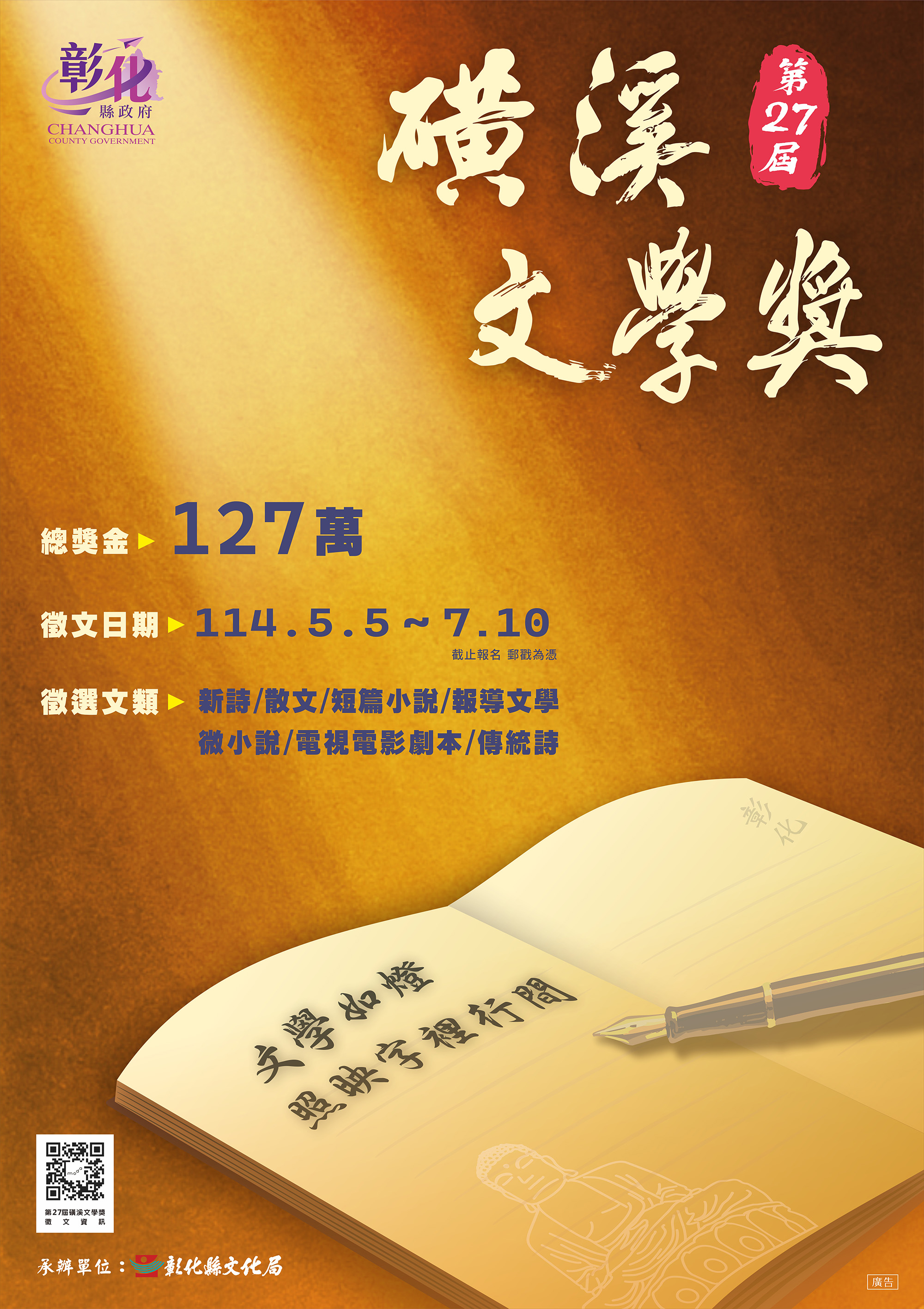 最新公告 【第27屆磺溪文學獎】徵文活動徵件日期自114年5月5日至7月10日止,歡迎踴躍參加投稿~ 歷史訊息 | 發布日期: 2025/05/12~2025/07/11 | 瀏覽人數: 60人 一、本徵文活動徵件日期自114年5月5日至7月10日止,徵選文類有新詩、散文、短篇小說、報導文學、微小說、電視電影劇本及傳統詩7類作品,各類選出磺溪獎1名,獎金為新臺幣4萬元至7萬元,並頒獎座1座;優選3至6名,獎金為新臺幣1萬元至3萬元,並頒發獎狀1紙。二、參加新詩類、散文類、短篇小說類、微小說類傳統詩類投稿者不限國籍,正體中文書寫,題材限與彰化意象有關;報導文學不限國籍,正體中文書寫,作品內容須書寫彰化縣風土民情者;電視電影劇本不限國籍,正體中文書寫,題材限與彰化意象有關,限為參選劇本之著作人。三、本徵文活動採網路報名,活動詳情請至彰化縣文化局官網(http://www.bocach.gov.tw)/主題專區/彰化文學/最新消息查詢。