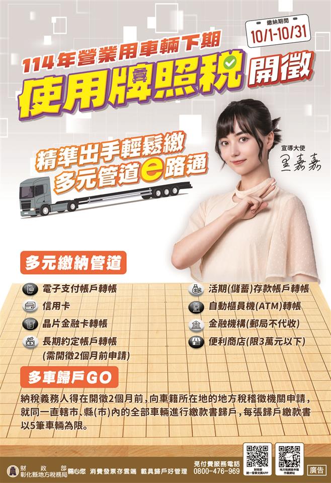 最新公告 【轉知】114年營業用車輛下期使用牌照稅開徵 發布日期: 2025/10/08~2025/11/08 | 瀏覽人數: 6人 一、 「114年營業用車輛下期使用牌照稅」託播訊息如下。(一) 託播期間:114年10月1日至10月31日。(二) 託播內容:114年營業用車輛下期使用牌照稅於10月開徵,繳納期間自10月1日至10月31日,請如期繳納,彰化縣地方稅務局關心您。二、 為加強宣導114年營業用車輛下期使用牌照稅相關訊息,其宣導影片可點選本局官方網站/主題服務/宣導專區/宣導影片連結或分享「彰化縣地方稅務局」YouTube頻道影片俾利協助宣導。三、 敬請將宣導訊息播出之相片,以e-mail(c0000115@changtax.gov.tw)傳送至本局。
