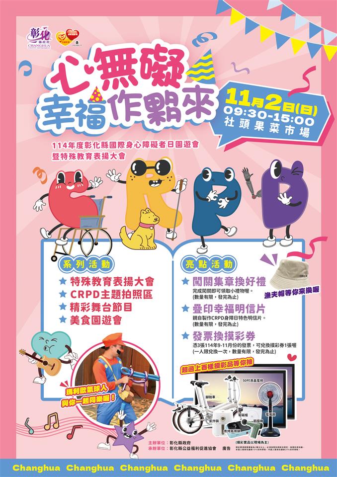 最新公告 【轉知】「心無礙 讓愛作夥來-114年度彰化縣國際身心障礙者日園遊會暨特殊教育表揚大會」活動 發布日期: 2025/10/23~2025/11/03 | 瀏覽人數: 23人 一、 為響應聯合國於1992年通過每年的12月3日為「國際身心障礙者日」,本縣特辦理旨揭活動邀請身心障礙者與社會大眾共同參與,以落實身心障礙者權利公約意旨,建立友善無障礙的社會。二、 活動於114年11月2日(星期日)上午9時30分至下午3時,假社頭果菜市場(彰化縣社頭鄉員集路三段750號)舉辦,參與對象為本縣身心障礙者社團及其家屬、一般民眾預計1,500人以上。三、 園遊會除美食攤位,現場設置CRPD探索區、輔具維修、義 剪及視障按摩、政令宣導攤位等,另有精彩表演節目魔幻彩龍互動秀、馬力歐氣球互動秀,並有疊印幸福明信片及闖關集章換好禮等活動,敬邀縣民朋友共襄盛舉。四、 隨函檢附活動宣傳單1份,請貴單位惠予協助運用多元管道(官網、跑馬燈、公告欄、粉絲專頁等)廣為宣傳,鼓勵所屬及民眾踴躍參加。