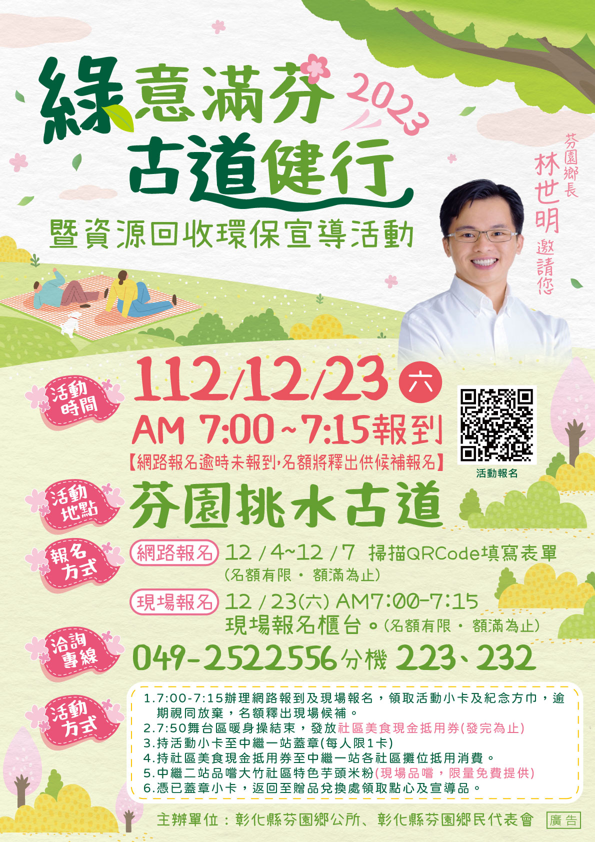 最新公告 綠意滿芬 古道健行 歷史訊息 | 發布日期: 2023/12/01~2023/12/24 | 瀏覽人數: 118人 | 聯絡資訊: 許小姐 049-2522556 #223 挑水古道是運動健行最佳景點,古道環境舒適,步道平整好走,歡迎大家相揪來芬園挑水古道健行拿好禮★活動日期:112/12/23(六)★活動地點:芬園挑水古道★網路報名:12/4~12/7活動當天07:00~07:15報到★現場報名:芬園挑水古道報名櫃台★名額有限,額滿為止★網路報名逾時未到,名額將現場釋出網路報名連結:https://www.beclass.com/rid=284b3c5654c8c4106ad0?fbclid=IwAR3qCJVbAWAsyZGGUbyvmFNAllFEGgvar976M7lhPTPaPd6n3d5WWAl8kcs