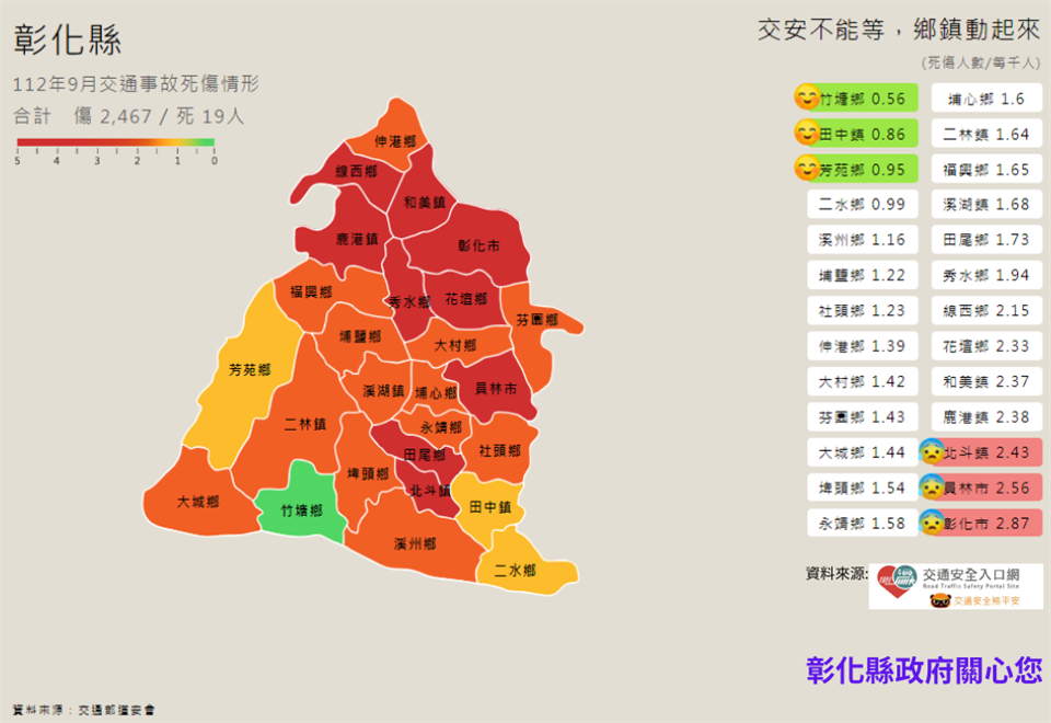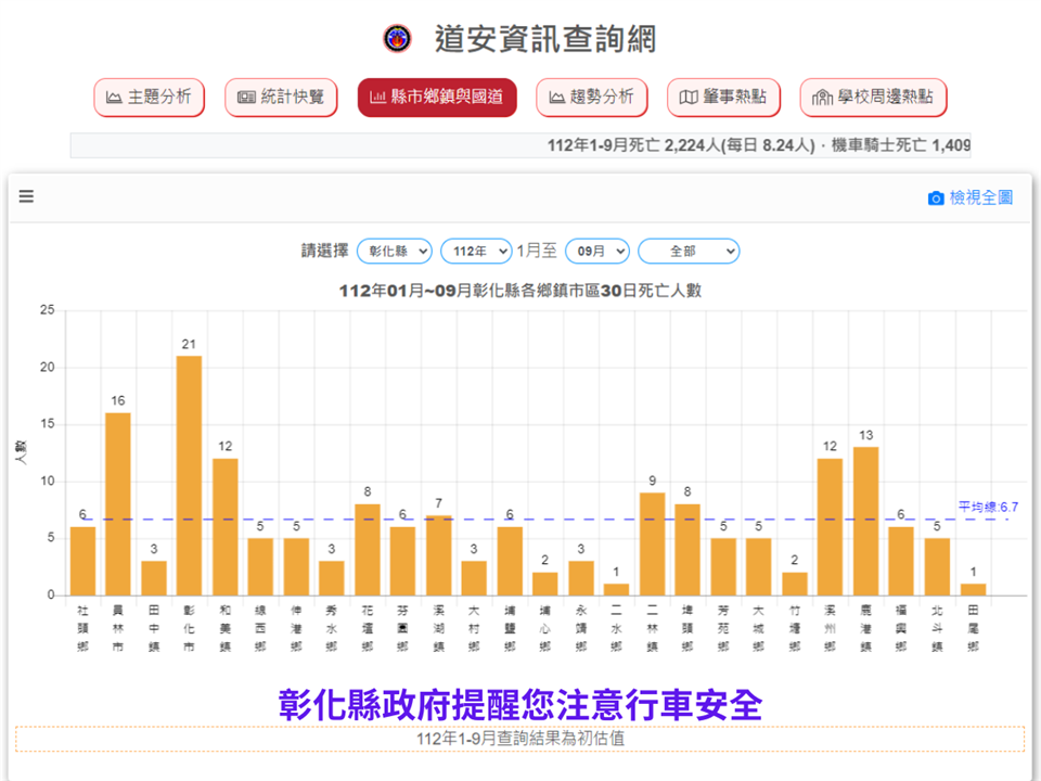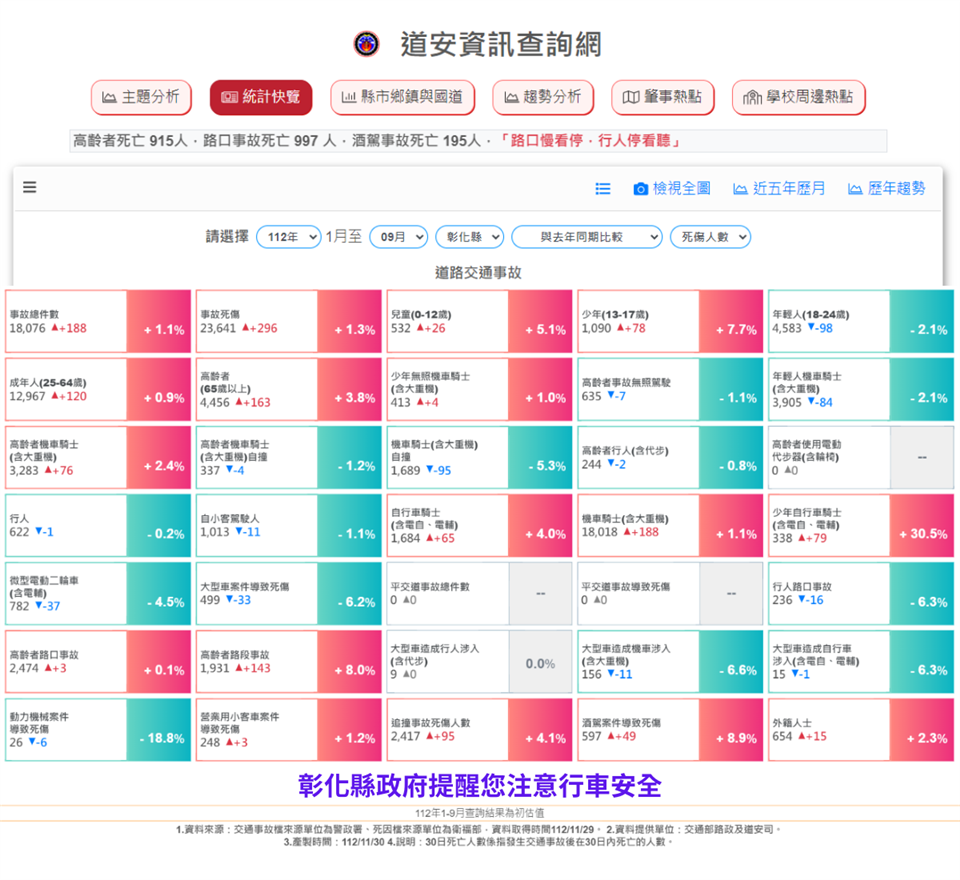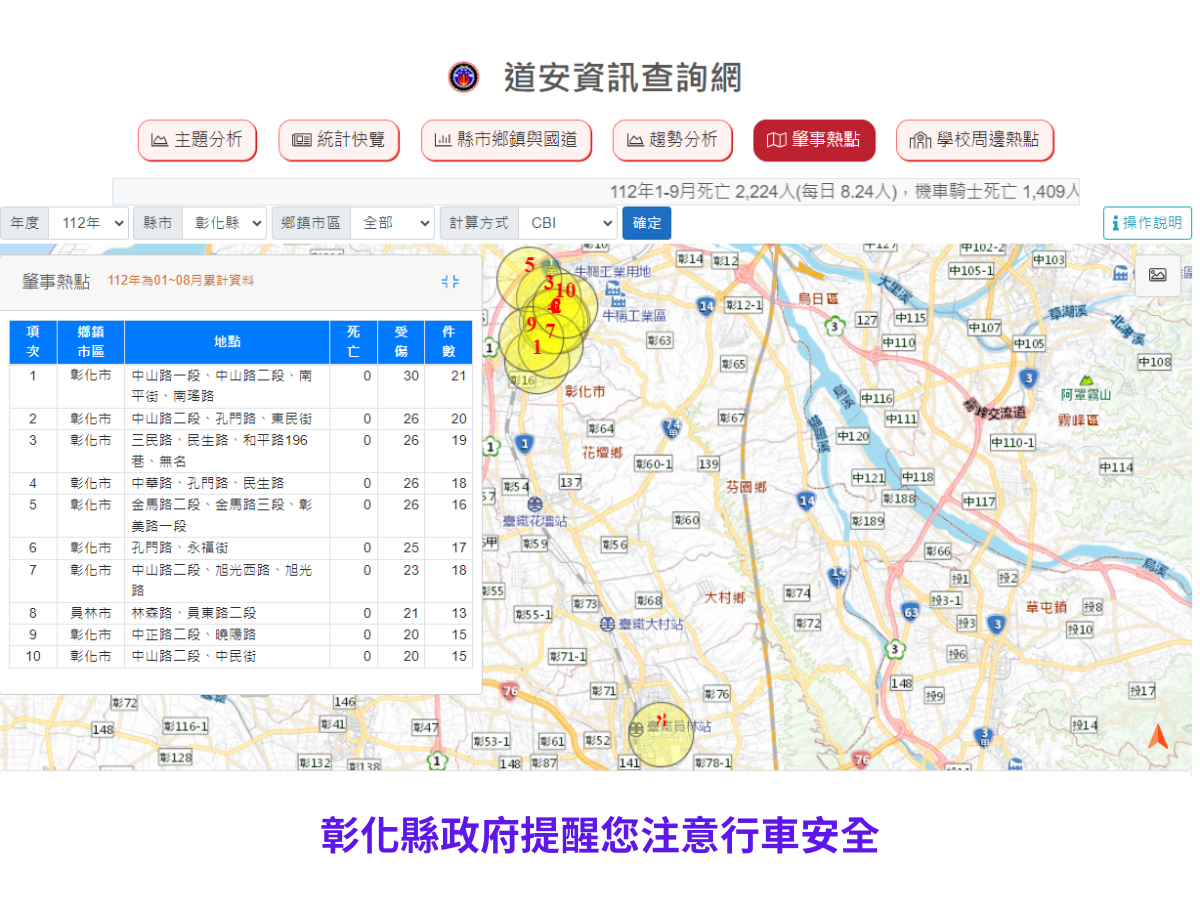 最新公告 彰化縣政府--交通安全宣導 歷史訊息 | 發布日期: 2023/12/11~2024/01/11 | 瀏覽人數: 42人 | 聯絡資訊: 蔡欣帆 049-2522556 (一)112年1-9月道路交通事故死傷累計23,641人,遠離大型車,保持安全車距,彰化縣政府關心您。(二)騎乘微型電動二輪車,請遵守交通規則。(三)站在人行道上,離路口距離三大步的位置等紅燈才安全。