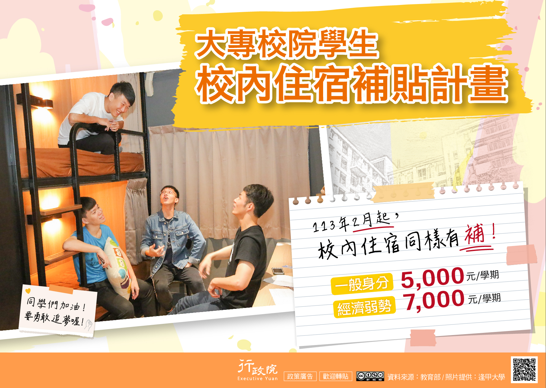 最新公告 「大專校院學生校內住宿補貼」--行政院新聞傳播處 歷史訊息 | 發布日期: 2023/12/21~2024/07/31 | 瀏覽人數: 28人 | 聯絡資訊: 蔡欣帆 049-2522556 為減輕學生校內住宿經濟負擔,政府自113年2月起,推動 「大專校院學生校內住宿補貼計畫」,幫助青年學子專注 學習,提高競爭力。