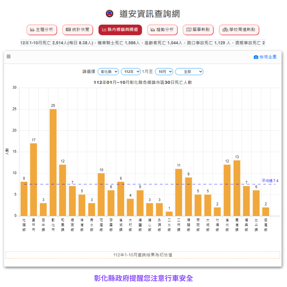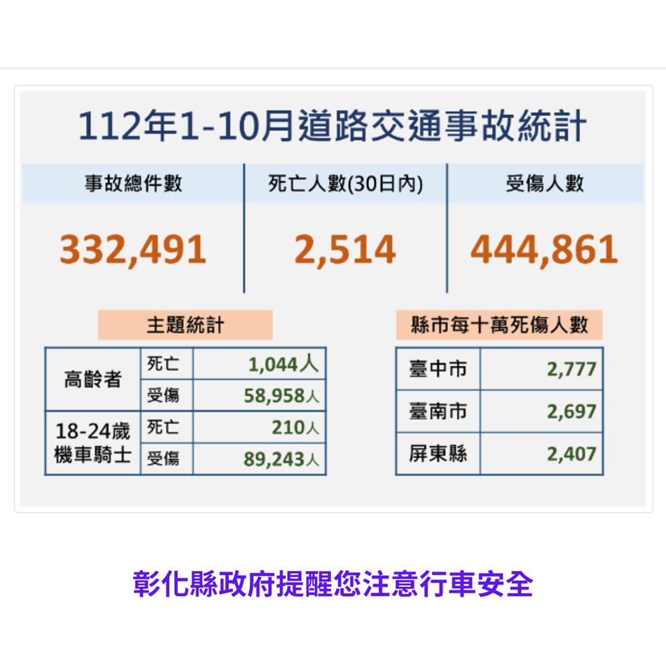 最新公告 「112年1-10月交通事故死傷情形、鄉鎮市交通事故統計表、本縣各鄉鎮市30日死亡人數及事故與違規熱點」~彰化縣政府宣導 歷史訊息 | 發布日期: 2024/01/11~2024/01/31 | 瀏覽人數: 27人 | 聯絡資訊: 蔡欣帆 049-2522556 #229 (一)112年1-10月道路交通事故死傷累計26,081人,遠離大型車,保持安全車距,彰化縣政府關心您。(二)騎乘微型電動二輪車,請遵守交通規則。(三)站在人行道上,離路口距離三大步的位置等紅燈才安全。