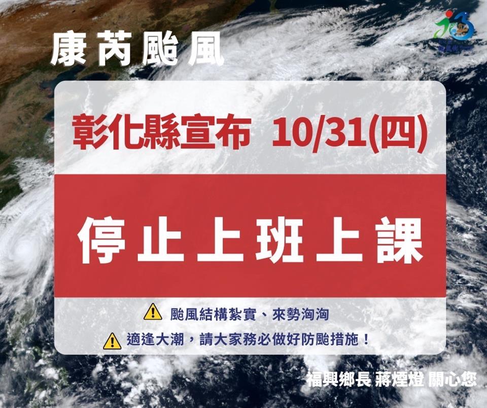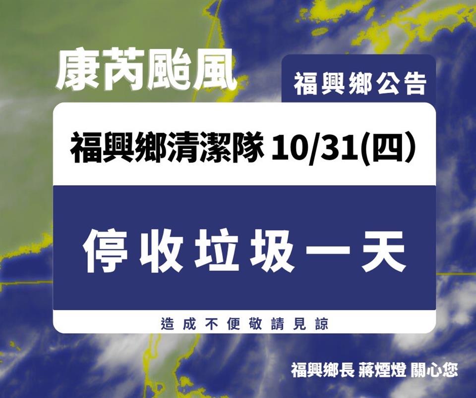 最新公告 康芮颱風(10/31)停收垃圾一日,造成不便請見諒! 歷史訊息 | 發布日期: 2024/10/30~2024/11/30 | 瀏覽人數: 49人 康芮颱風來勢洶洶,彰化縣政府宣布10/31(四)停班、停課。請大家務必做好防颱措施、注意安全,非必要不要出門!明日(10/31)清潔隊停收垃圾一日!福興鄉公所將於10/31上午9:00開設颱風災防中心,如有任何問題,請撥打公所電話:04-7772066